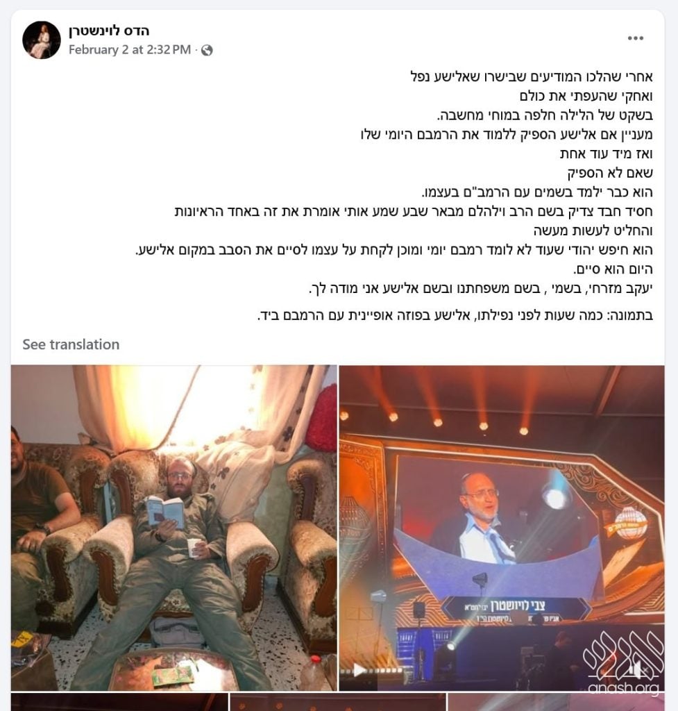 His wife, Hadas, shared that upon receiving the tragic news, the thought entered her mind: “I hope Elisha managed to finish his daily Rambam study.”