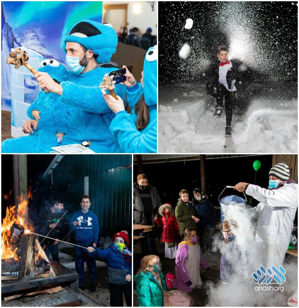 Rabbi Pesach, wearing an Eskimo costume, welcomed the crowd. Chana Burston, dressed as a Snow Queen, handed costume prizes and activity bags to children and teens. Families enjoyed taking their photos in the arctic photo spot with a vintage wooden sled and winter scenery. The party continued in the outdoor pavilion, where families enjoyed an “Arctic menu” of hot stews, soups, kugels, desserts and hot cocoa. A campfire added warmth as well as the opportunity to roast marshmallows.