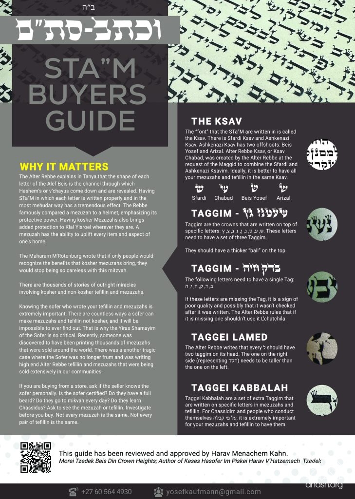 If we can give our community the language of STa”M — the ability to ask, to discern, and to take pride in the beauty and hiddur of these holy items — we will be fulfilling not only a halachic responsibility but also a directive of the Rebbe: to ensure that every Yid is surrounded, physically and spiritually, by the Kedusha of kosher mezuzahs and tefillin.
