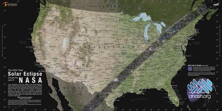 Monday’s total solar eclipse will cross North America, passing over Mexico, the United States, and Canada. The total solar eclipse will begin over the South Pacific Ocean. Weather permitting, the first location in continental North America that will experience totality is Mexico’s Pacific coast at around 2:07 p.m. EST.