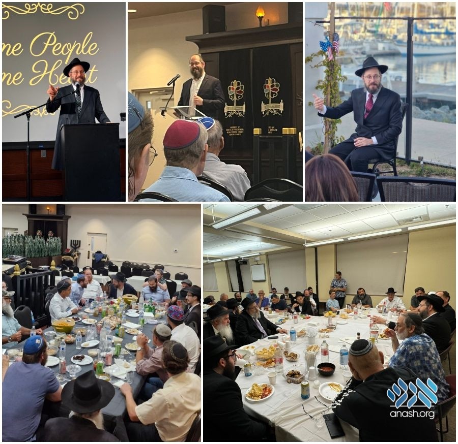Next stop? Oxnard. Rabbi Shishler ran a stress-management workshop overlooking the Oxnard marina. Over Friday night dinner, he held the crowd spellbound with stories of the Rebbe’s prophetic guidance to Jewish South Africa. “Rabbi Shishler resonated with the crowd,” said Rabbi Dov Muchnik of Chabad of Oxnard. “He delivered talks that were interesting, engaging, and packed with humor and depth. Each talk drew a different crowd, making it really special.”