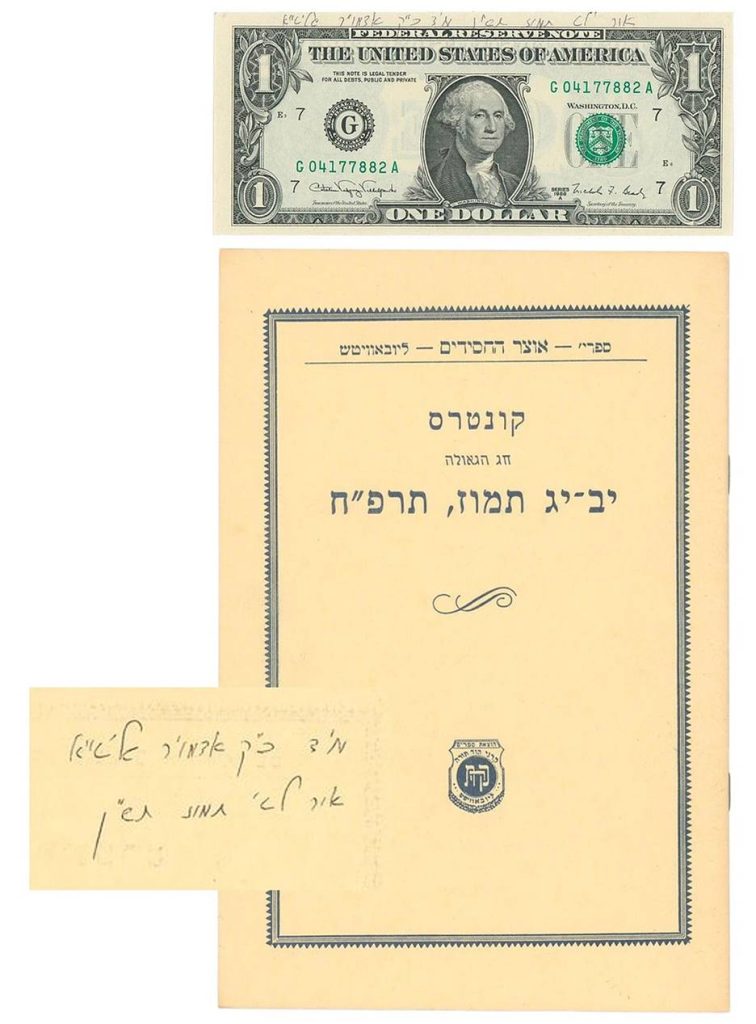 Continuing with a fabulous selection of Kuntreisim the Rebbe handed out on various occasions, each one accompanied by the dollar(s). & original plastic pouch.