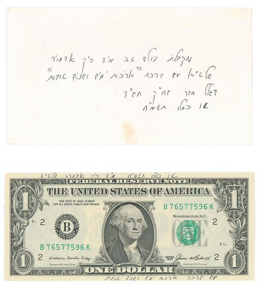 A Special One Dollar Bill Received from the Holy Hands Lubavitcher Rebbe, on the 15th day of Kislev 5748 with a Bracha for Arichat Yamim VeShanim Tovot – Blessing for Long Life