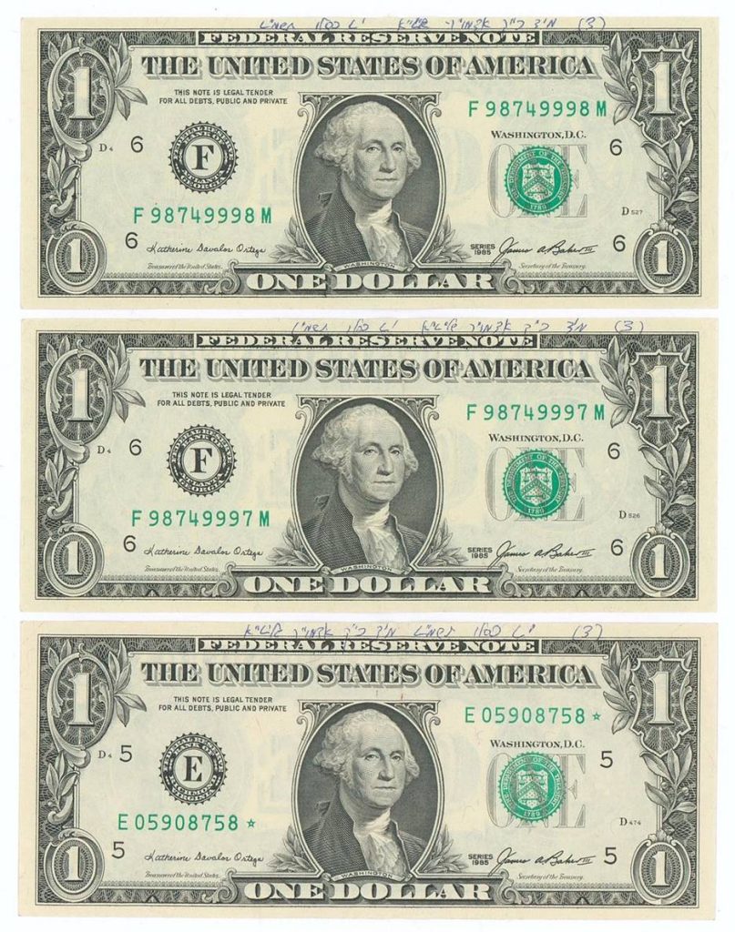 Three One Dollar Bills Received from Holy Hands of the Lubavitcher Rebbe, on the 19th day of Kislev 5749; The “Rosh Hashanah of Chassidut”