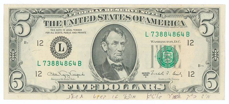 A Special Five Dollar Bill Received from the Holy Hands of the Lubavitcher Rebbe, on “Tu BiShvat” the15th day of Shvat, 5751.