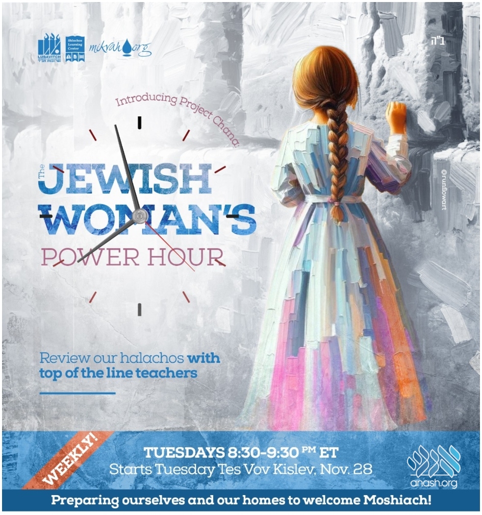 Project Chana is an organization that aims to empower women globally with a practical approach to learning the halachos of Kashrus, Shabbos, and Taharas Hamishpacha. Featuring top of the line teachers, the program provides clear, inspiring guidance for fulfilling these mitzvos with strength and beauty. In response to the urgency brought by the war in Eretz Yisroel, the program’s launch on the 15th of Kislev is dedicated to preparing ourselves and our homes to welcome Moshiach, may it be immediate.