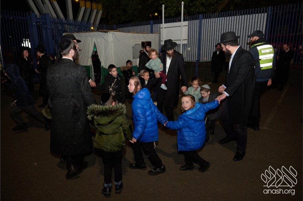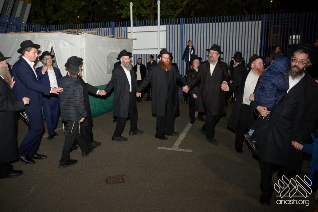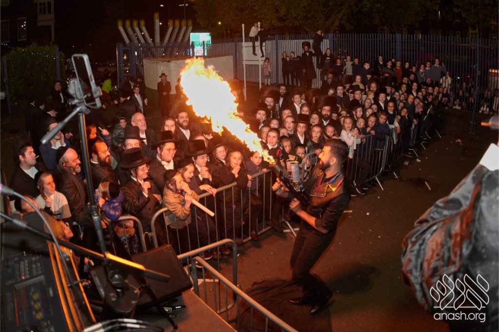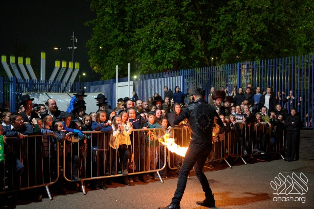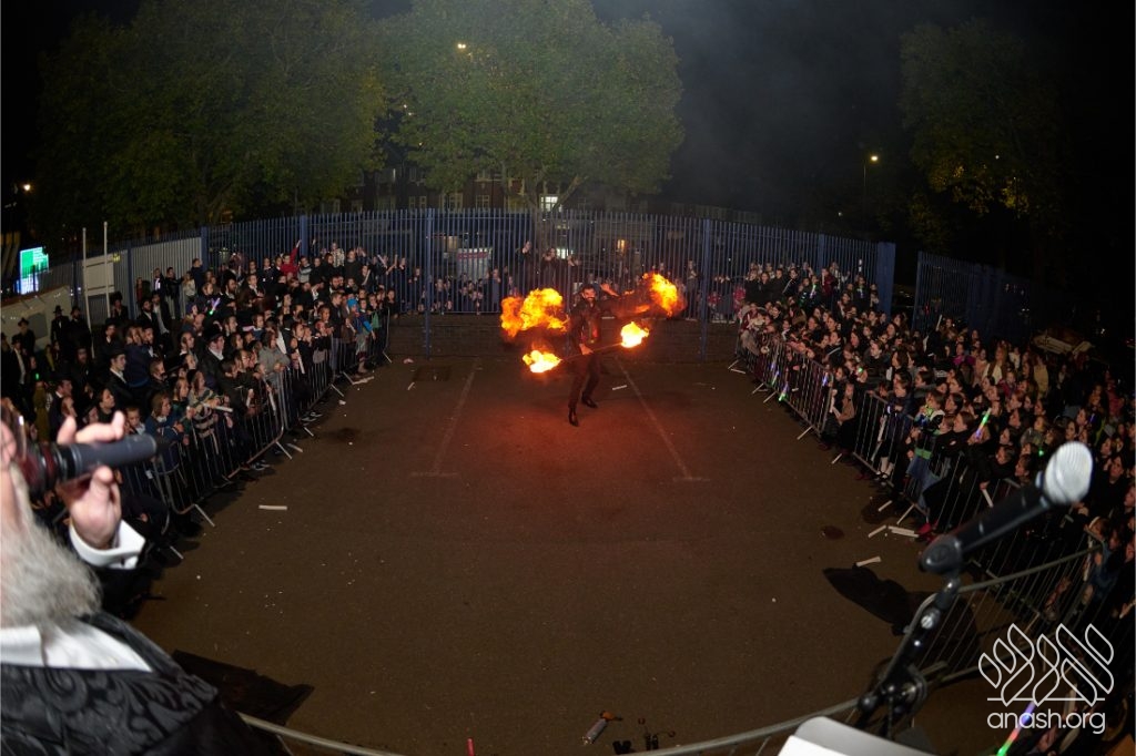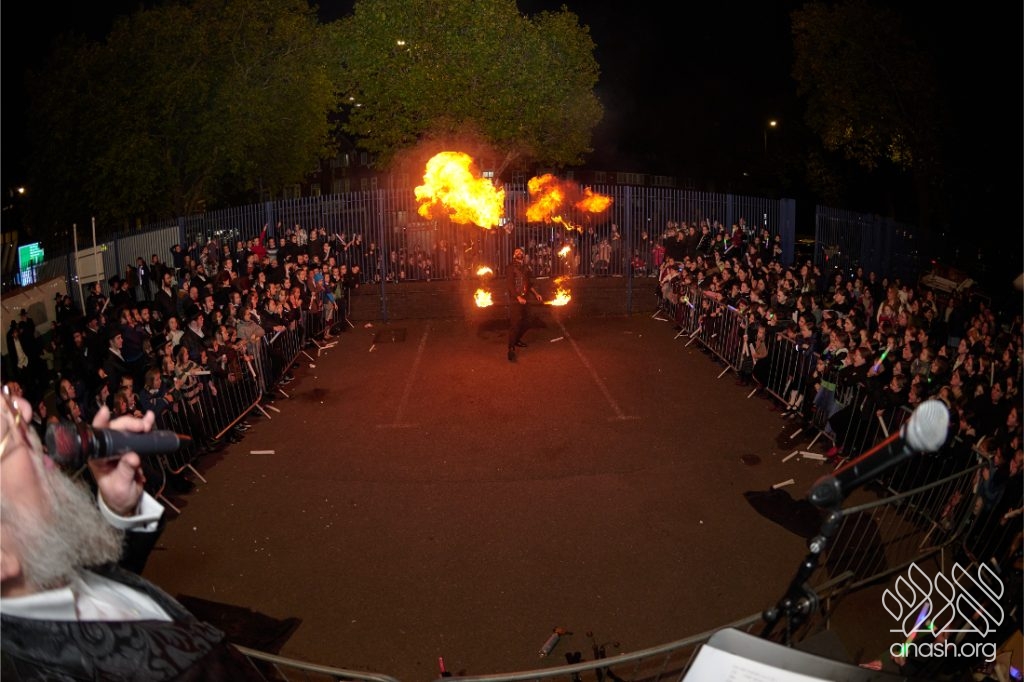Hundreds of Yidden from all backgrounds gathered at Lubavitch House in Stamford Hill, England, for a large Simchas Beis Hashoeiva celebration on Chol Hamoed Sukkos, complete with a spectacular fire show and joyous dancing.