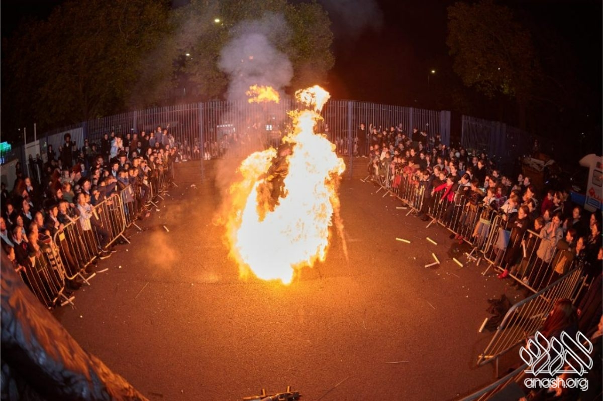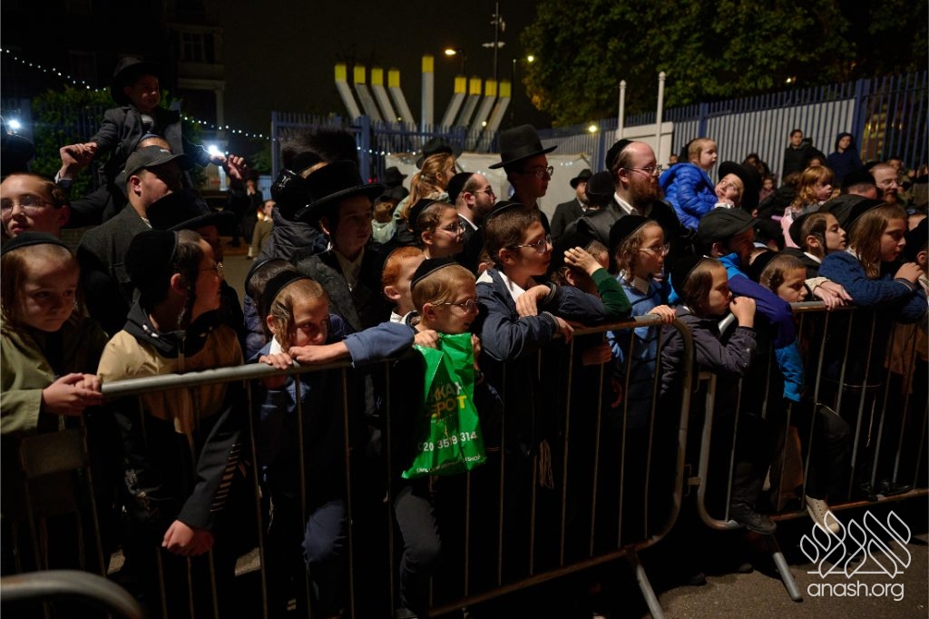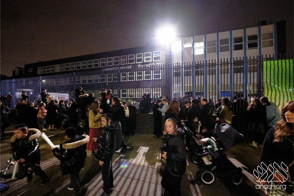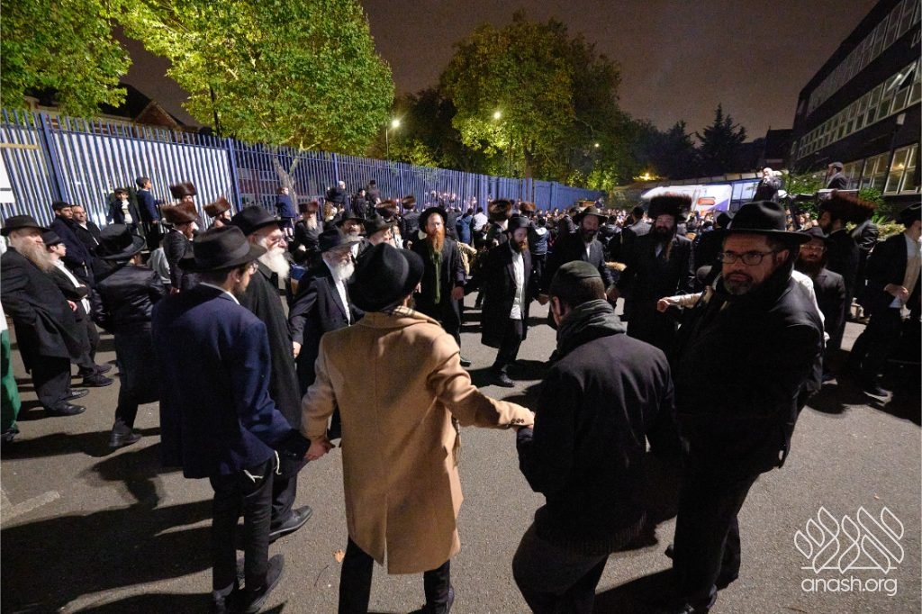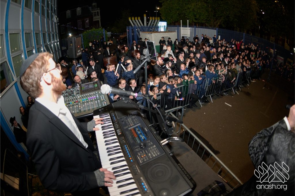 Hundreds of Yidden from all backgrounds gathered at Lubavitch House in Stamford Hill, England, for a large Simchas Beis Hashoeiva celebration on Chol Hamoed Sukkos, complete with a spectacular fire show and joyous dancing.