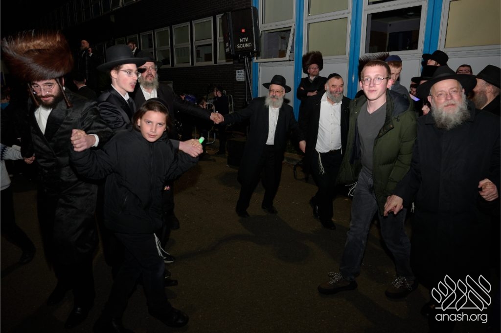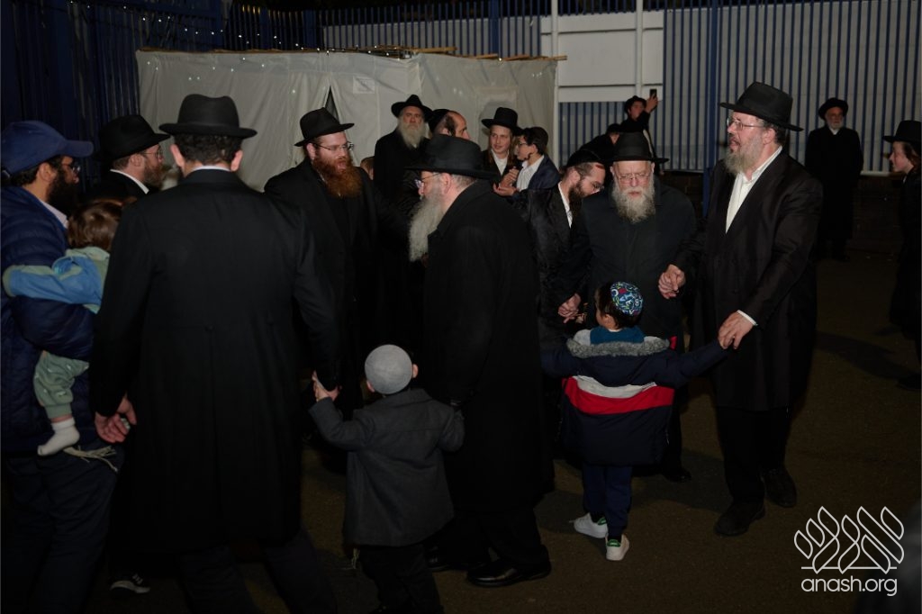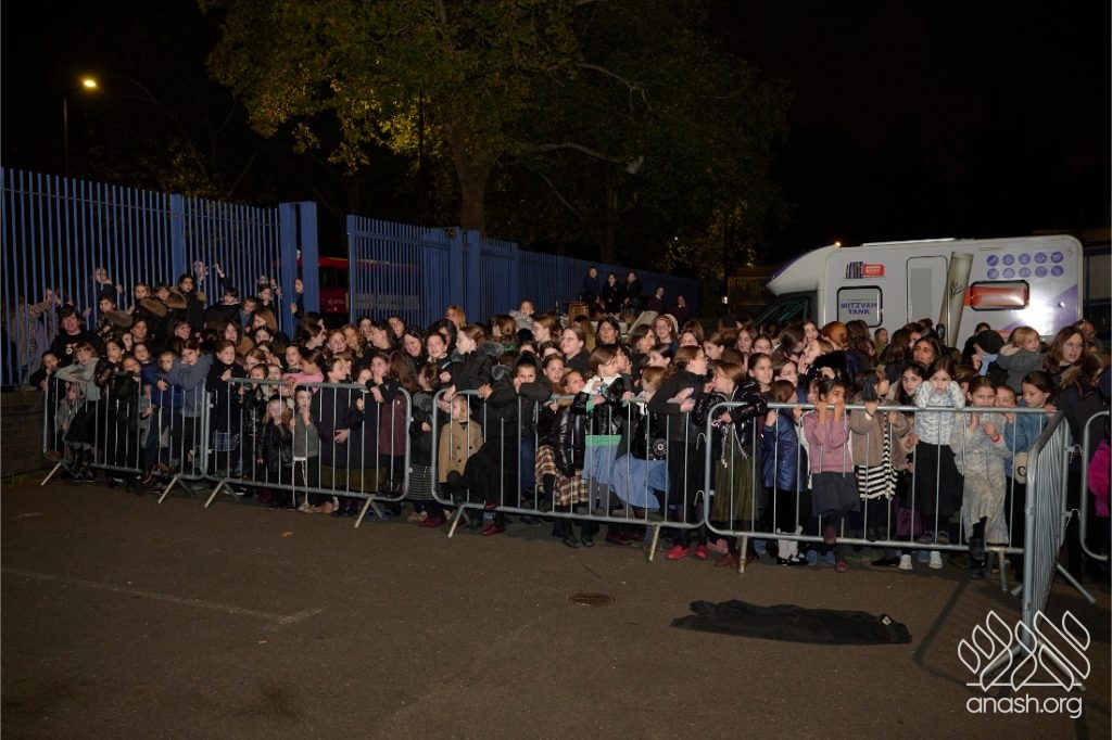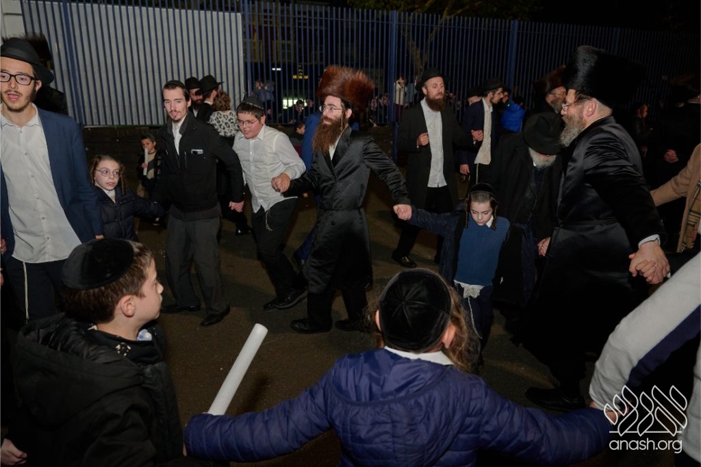Hundreds of residents from the Stamford Hill community in London gathered at Lubavitch House in for a large Simchas Beis Hashoeiva celebration on Chol Hamoed Sukkos.