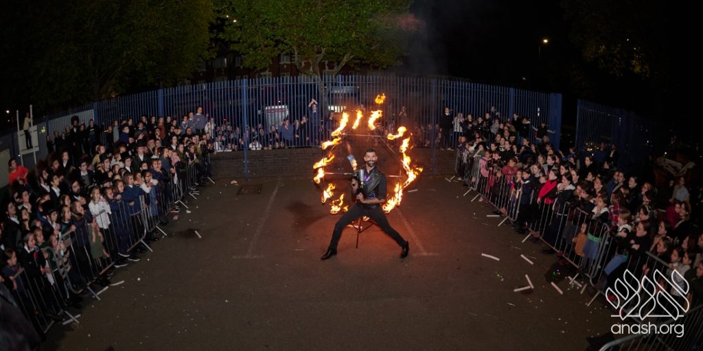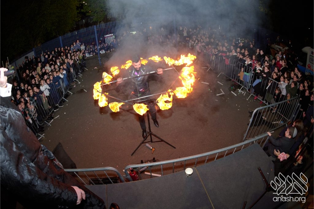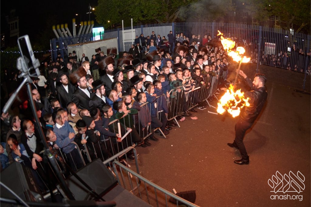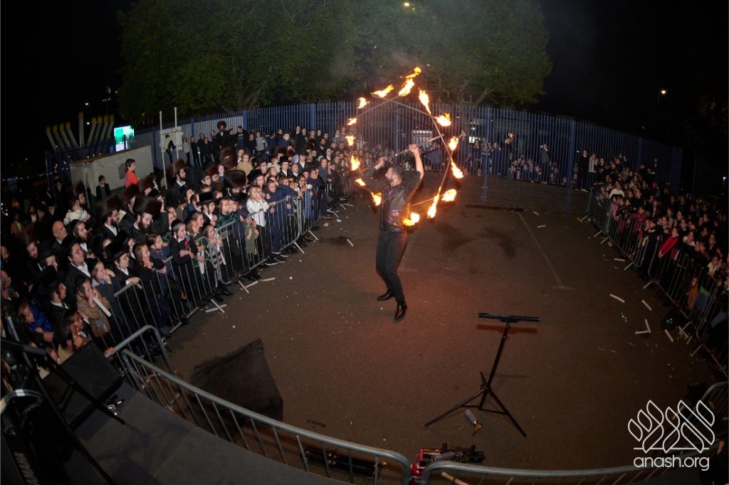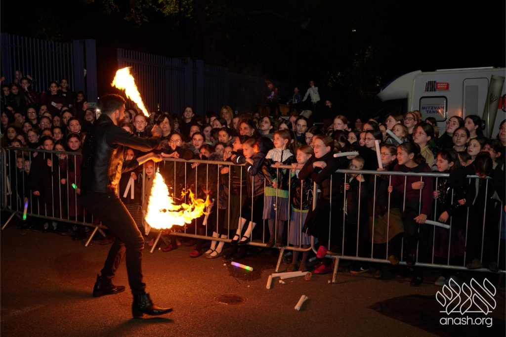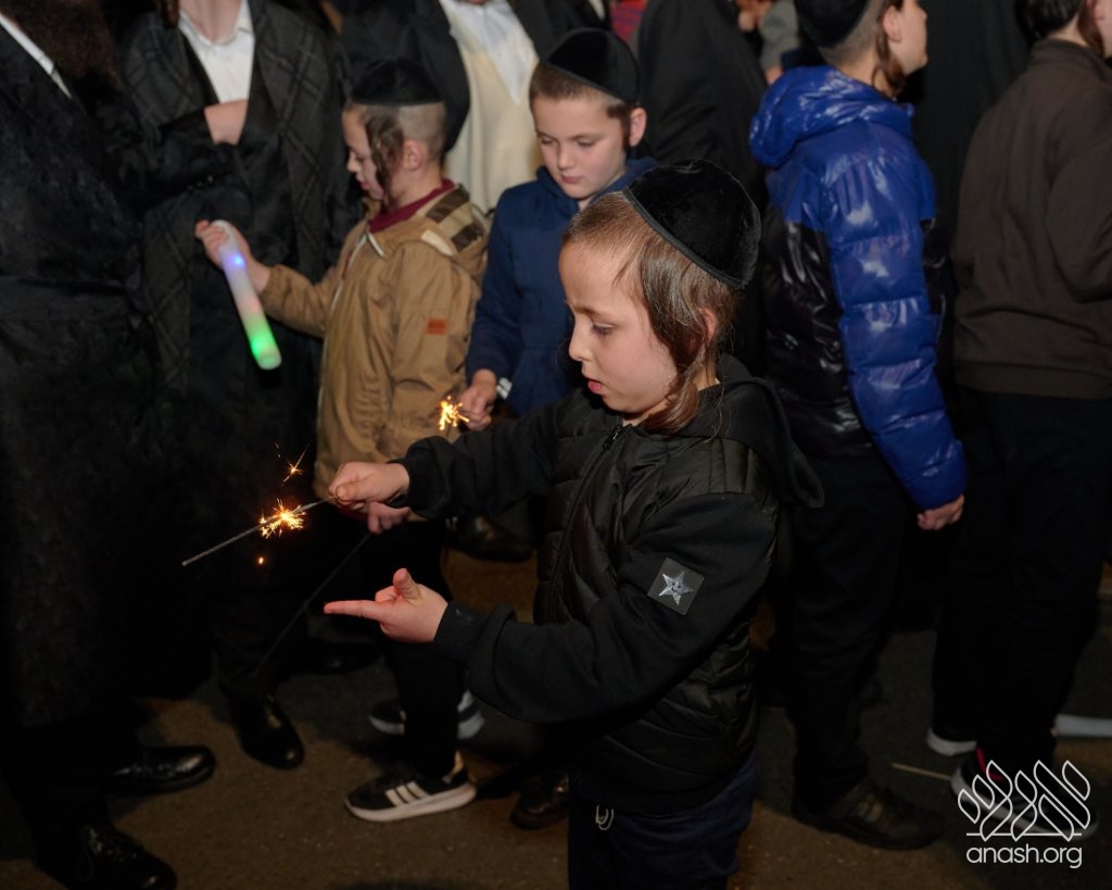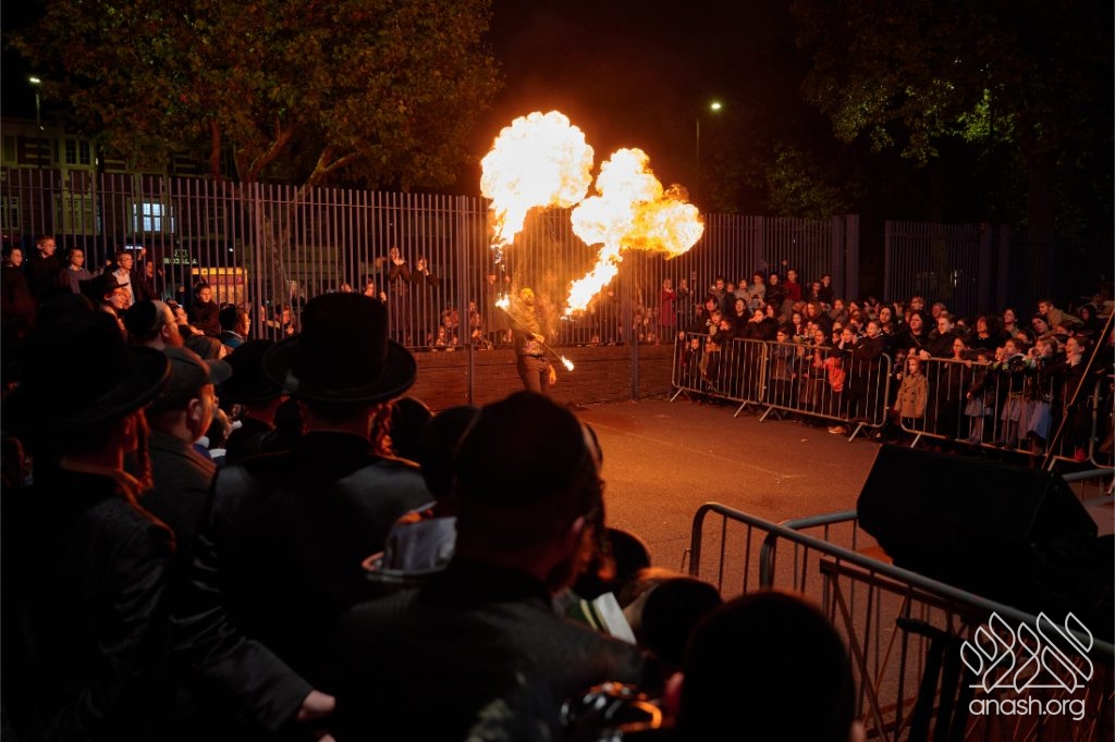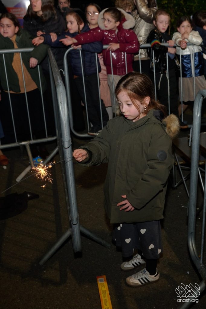 The evening began with children proudly reciting the Twelve Pesukim, followed by a spectacular fire-juggling show by a well-known entertainer that delighted young and old alike. Afterward, the crowd broke into lively dancing and joyous niggunim that filled the streets for many long hours.