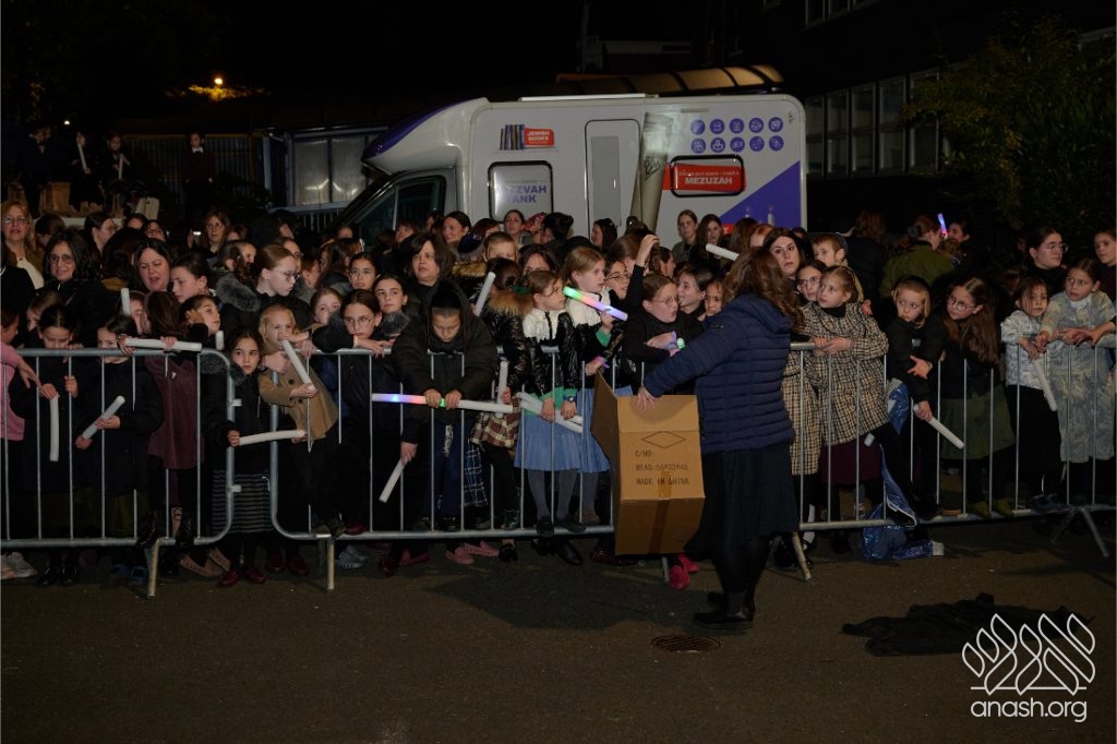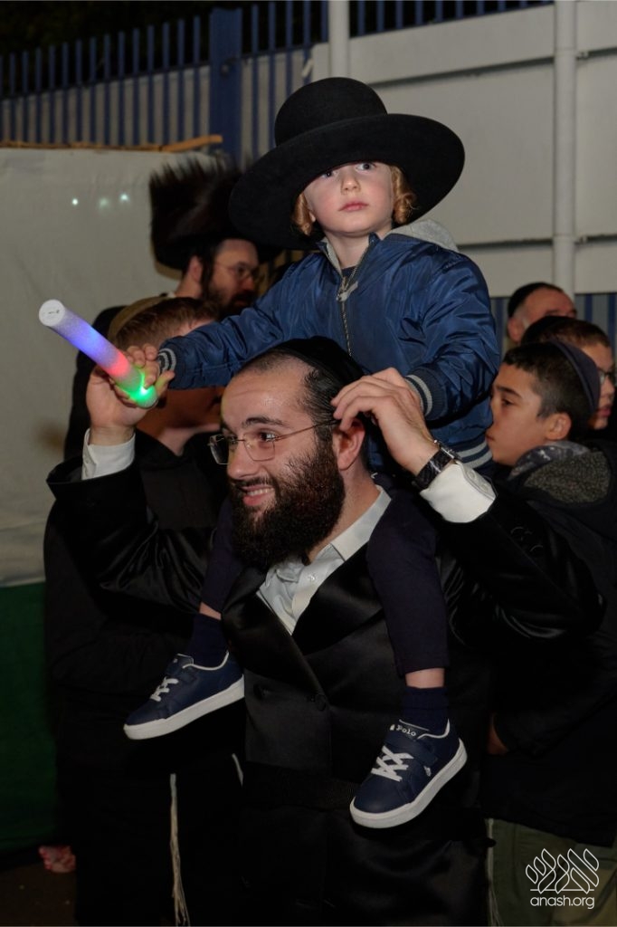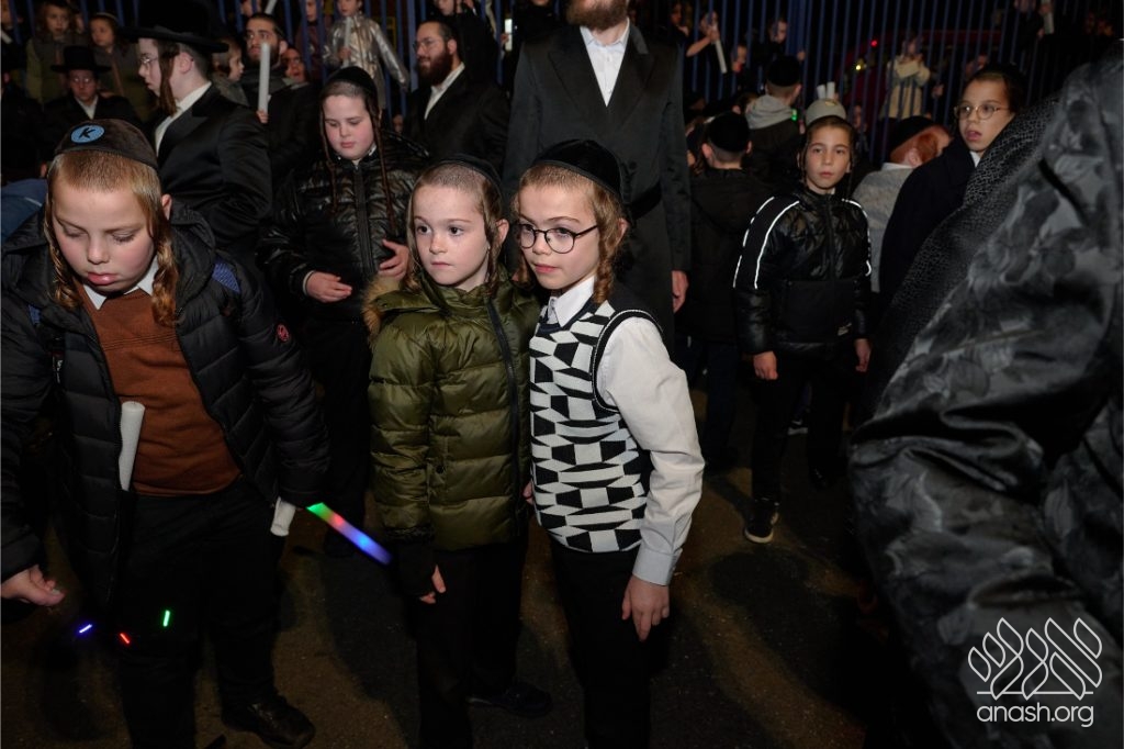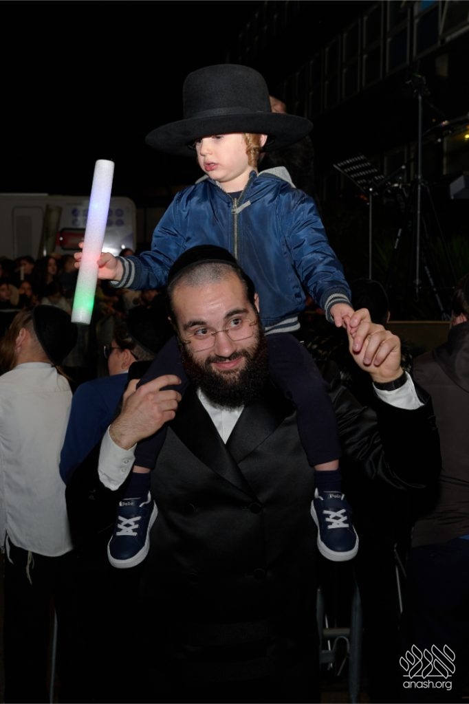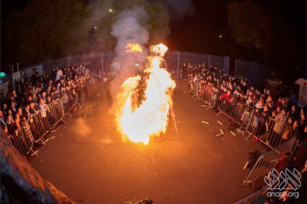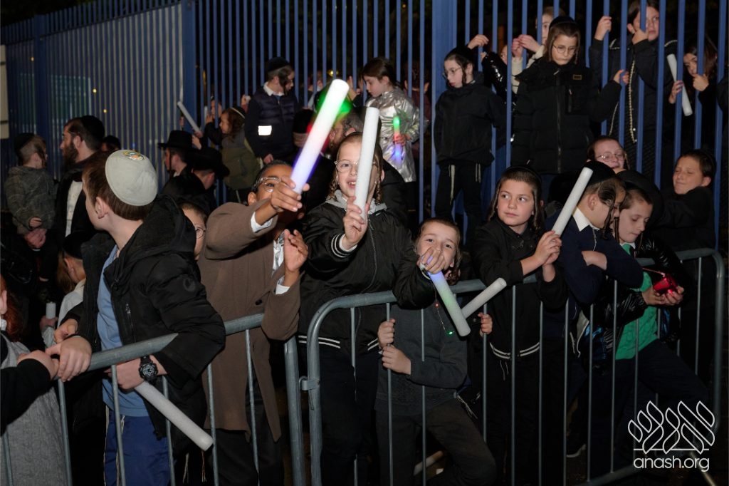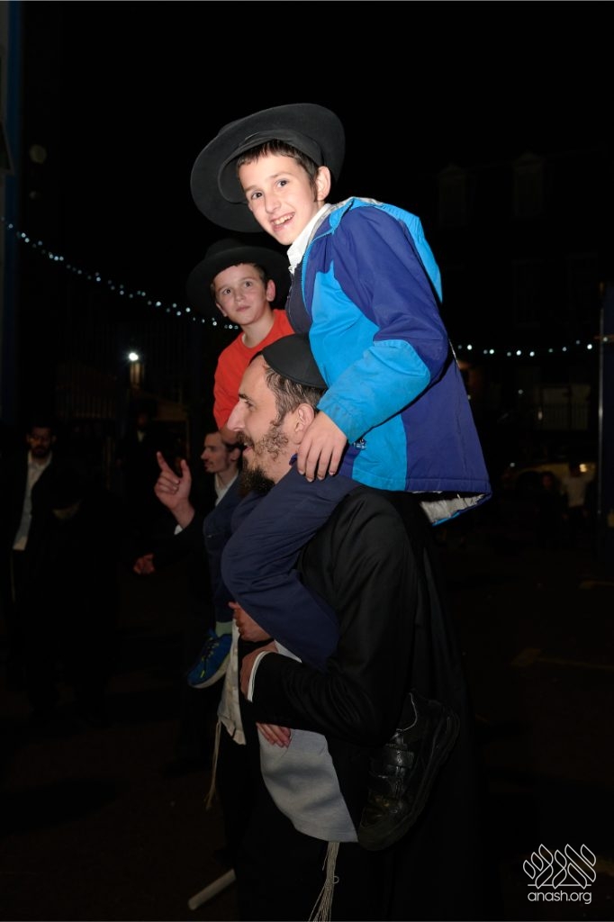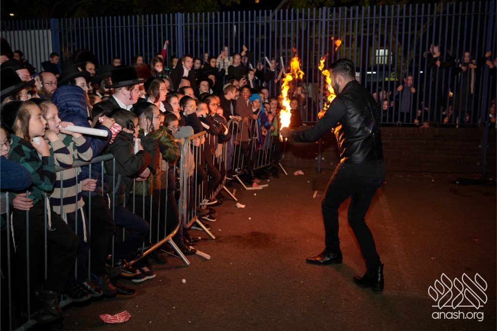 The evening began with children proudly reciting the Twelve Pesukim, followed by a spectacular fire-juggling show by a well-known entertainer that delighted young and old alike. Afterward, the crowd broke into lively dancing and joyous niggunim that filled the streets for many long hours.