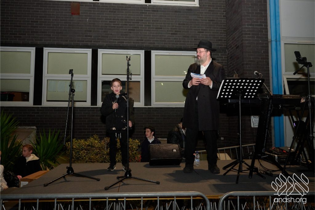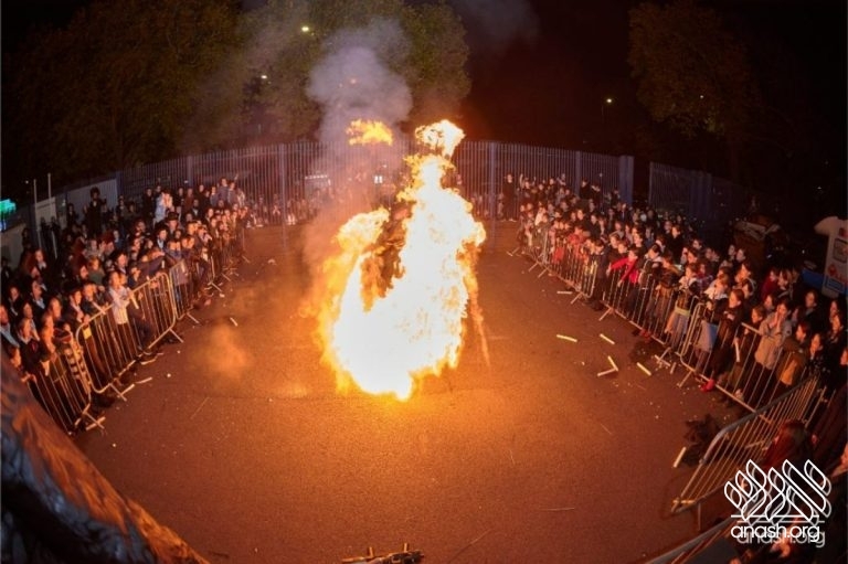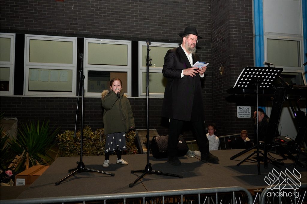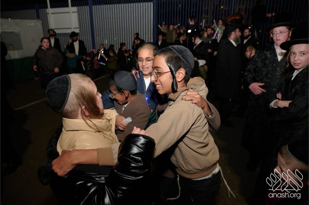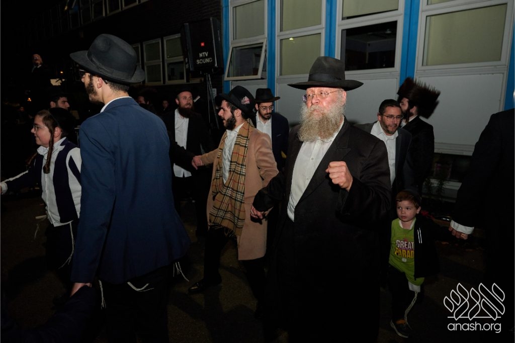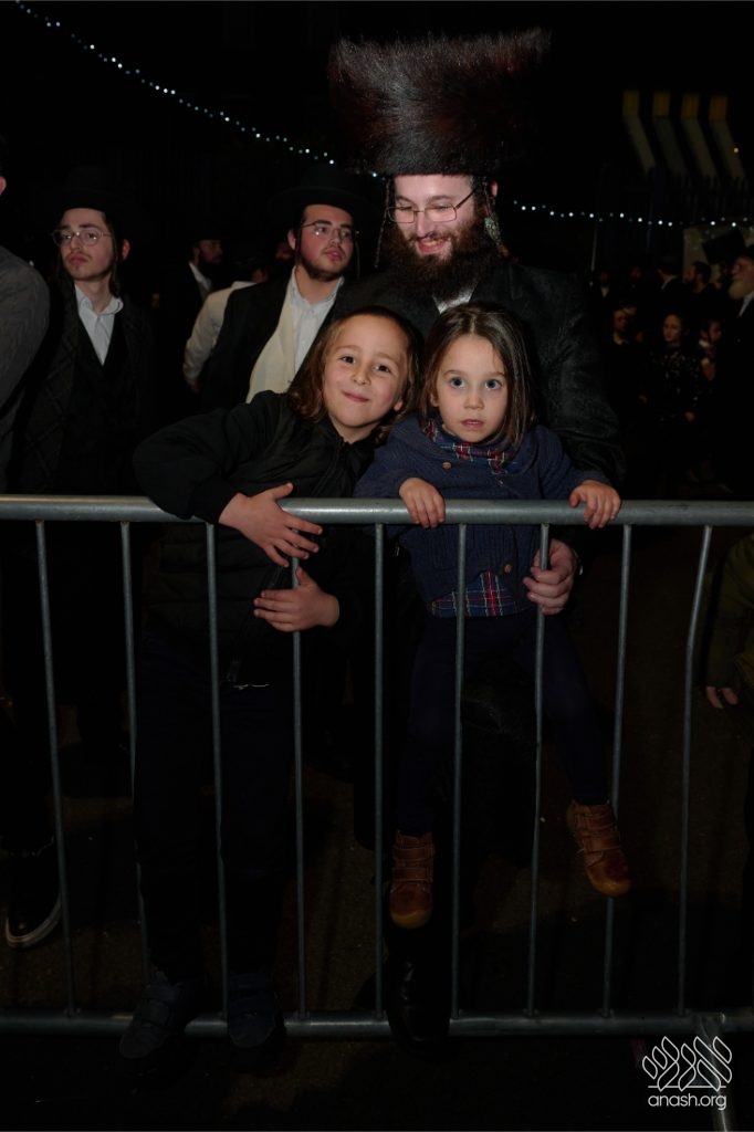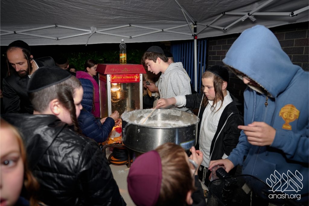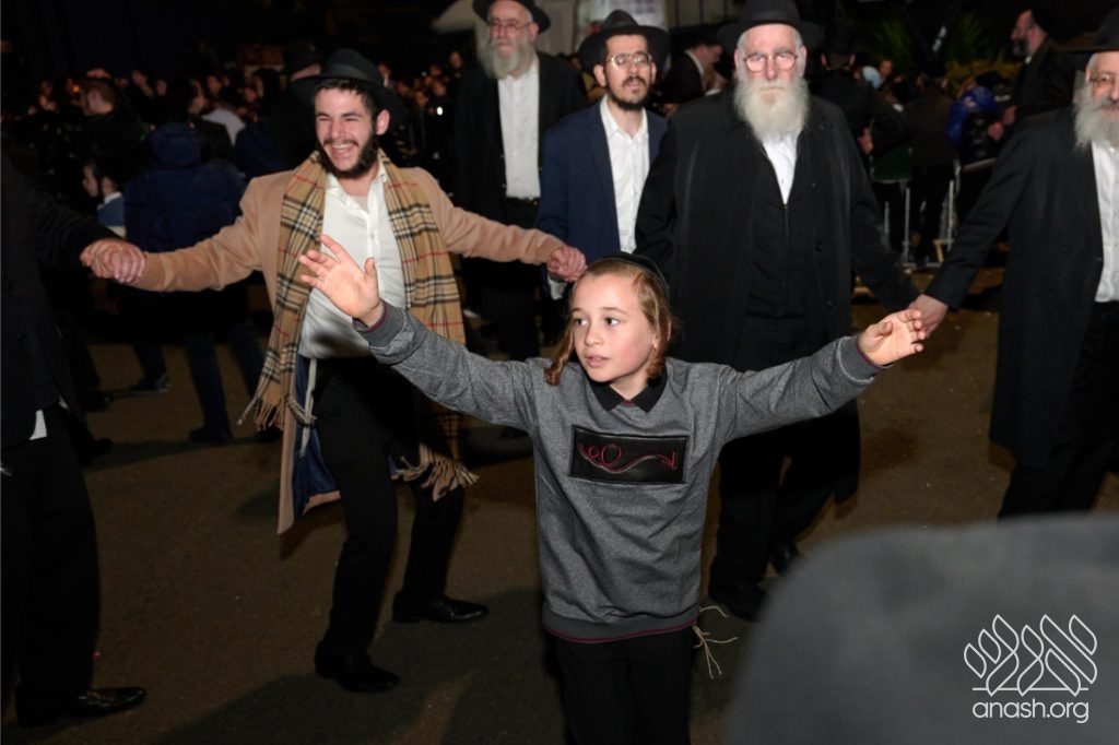 The evening began with children proudly reciting the Twelve Pesukim, followed by a spectacular fire-juggling show by a well-known entertainer that delighted young and old alike. Afterward, the crowd broke into lively dancing and joyous niggunim that filled the streets for many long hours.