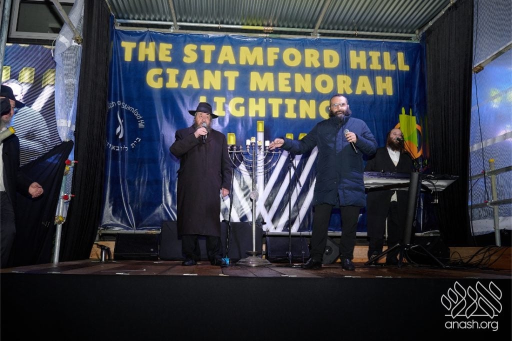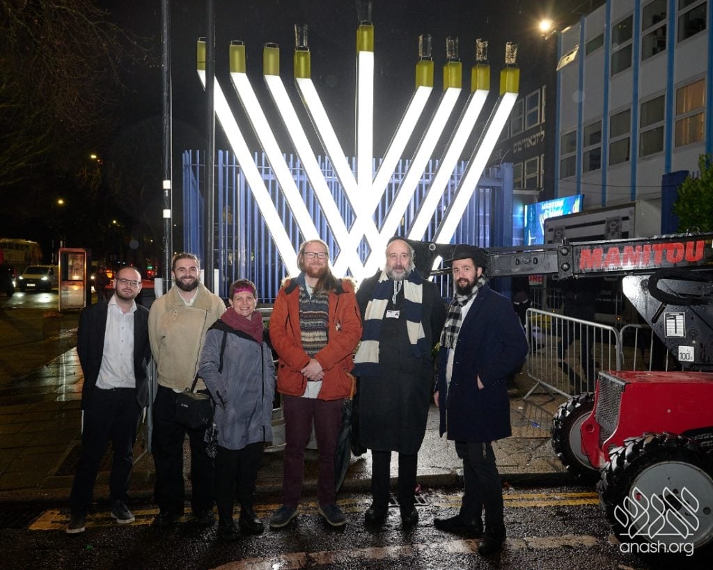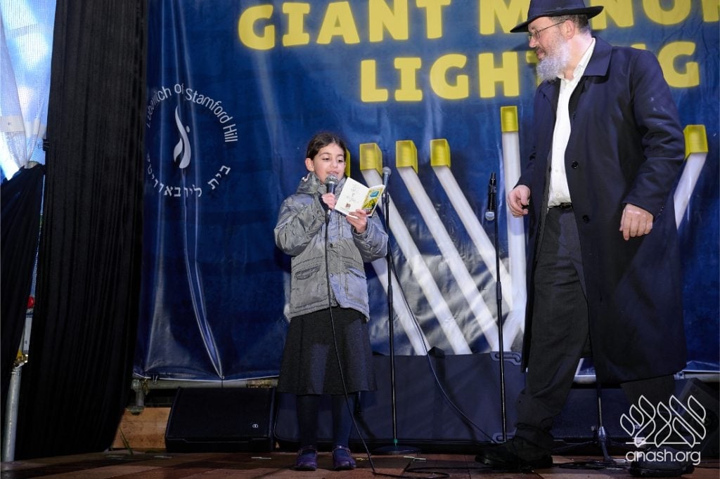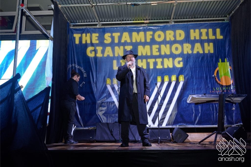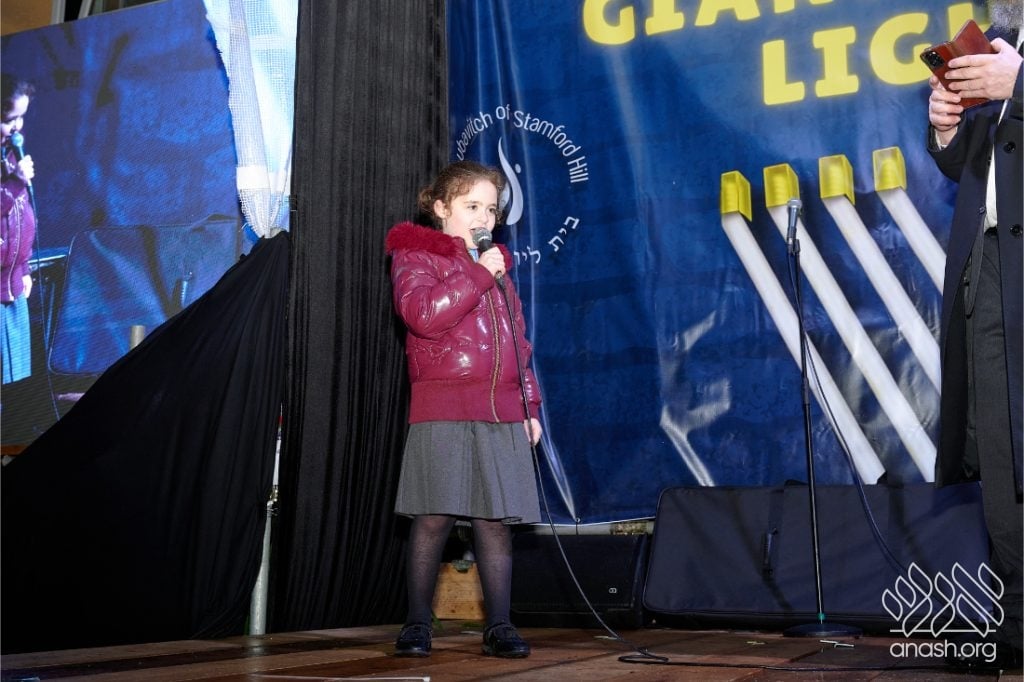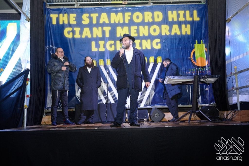 Despite heavy rain throughout the day, the local community came together for a joyous public menorah lighting organized by Lubavitch Stamford Hill and the Lubavitch Children’s Centre, under the leadership of Rabbi Sholem Ber and Devorah Leah Sudak, and Rabbi Mendel and Miri Sudak. The rain cleared just before 6:00 pm, allowing the festivities to go ahead as planned.