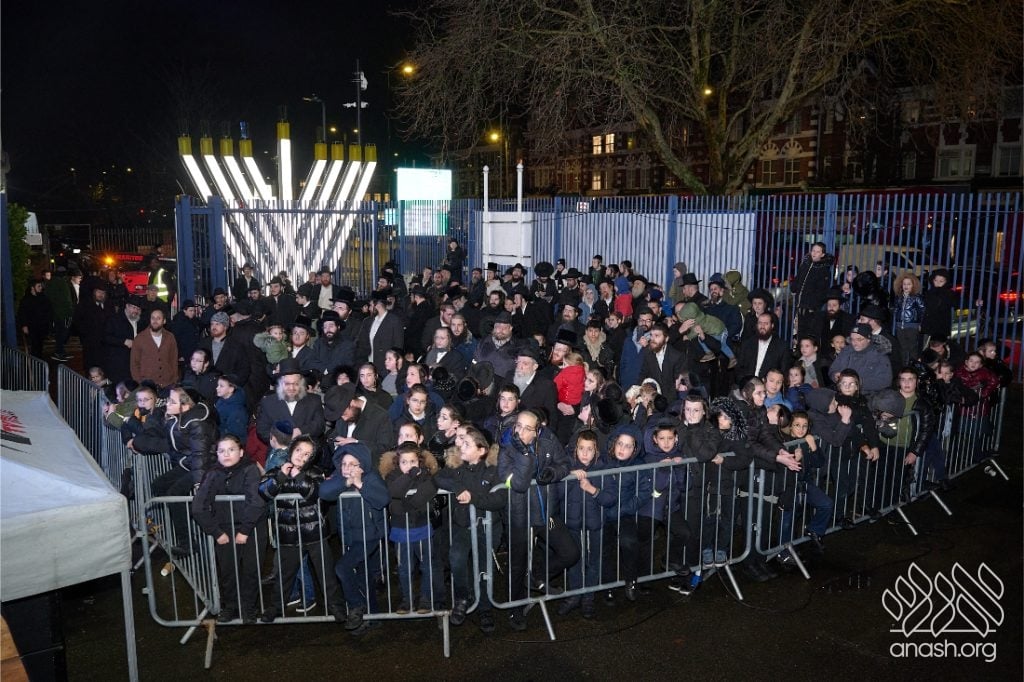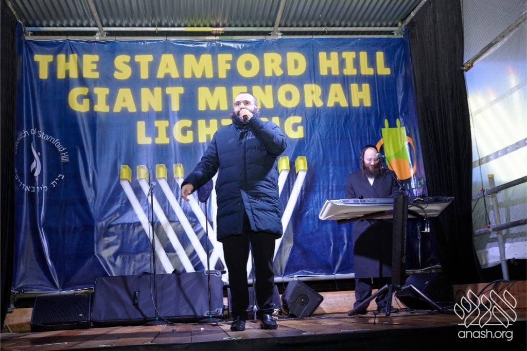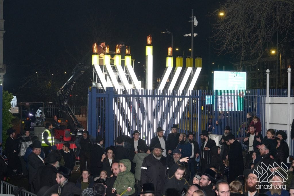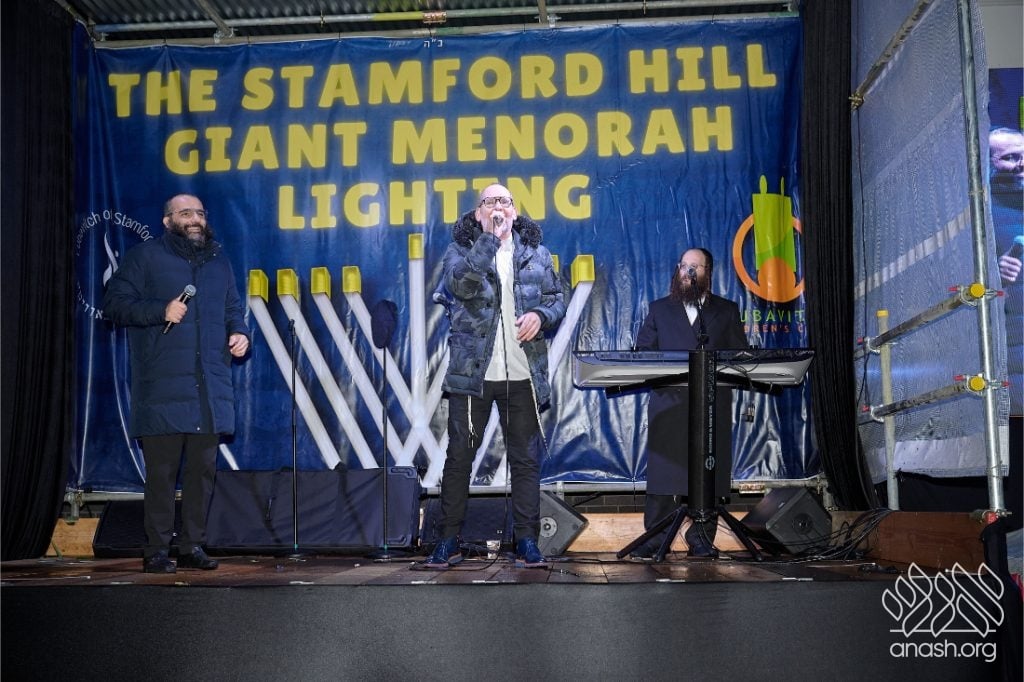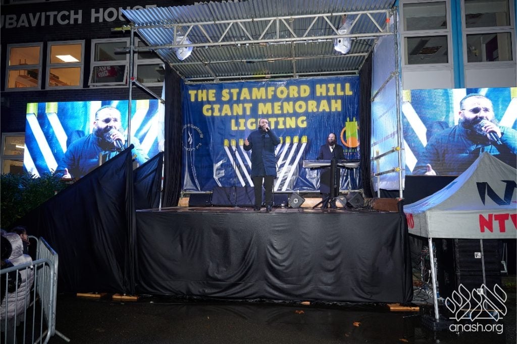Despite heavy rain throughout the day, hundreds from the Stamford Hill community came together for a joyous public menorah lighting at Lubavitch House, featuring music, dancing, and a spectacular fire show.