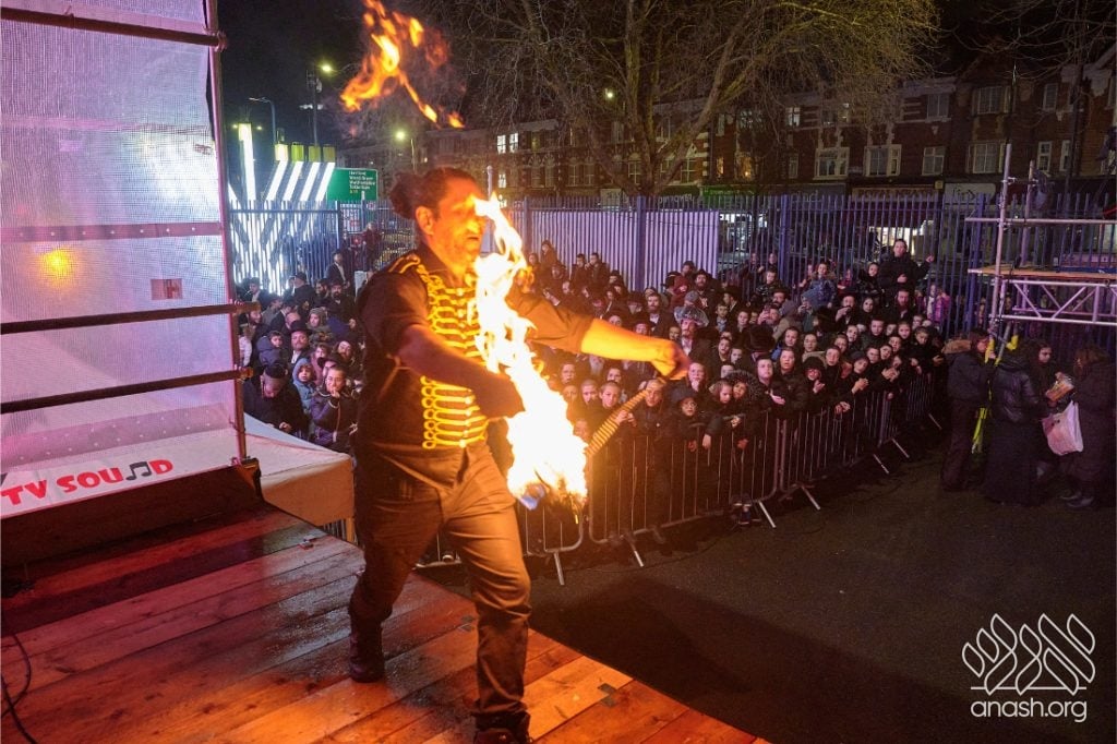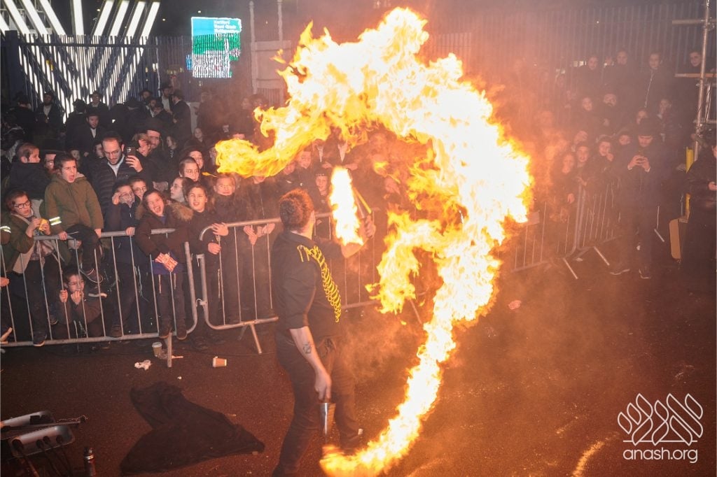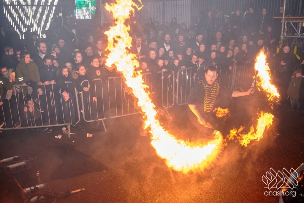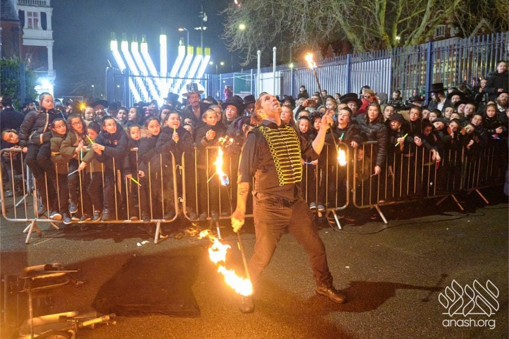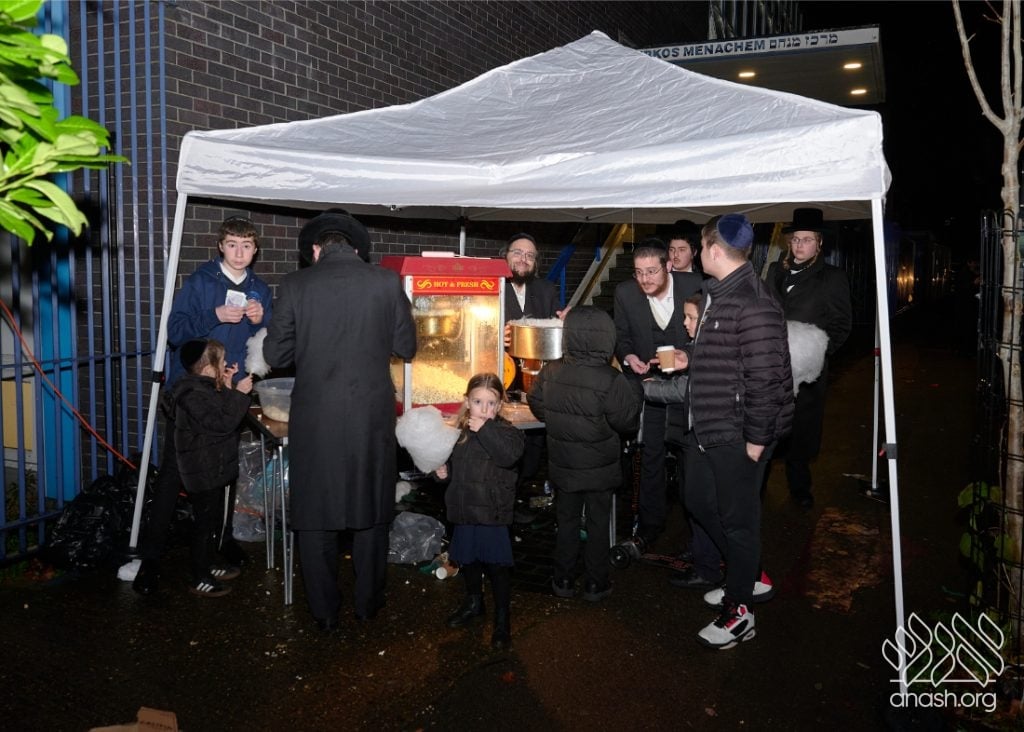 Entertainment included performances by singers Yoni Shlomo and Yishai Lapidus, with music by Shaya Austerlitz, as well as a spectacular fire show. Free doughnuts and glow bands were distributed to children, adding to the festive atmosphere.
