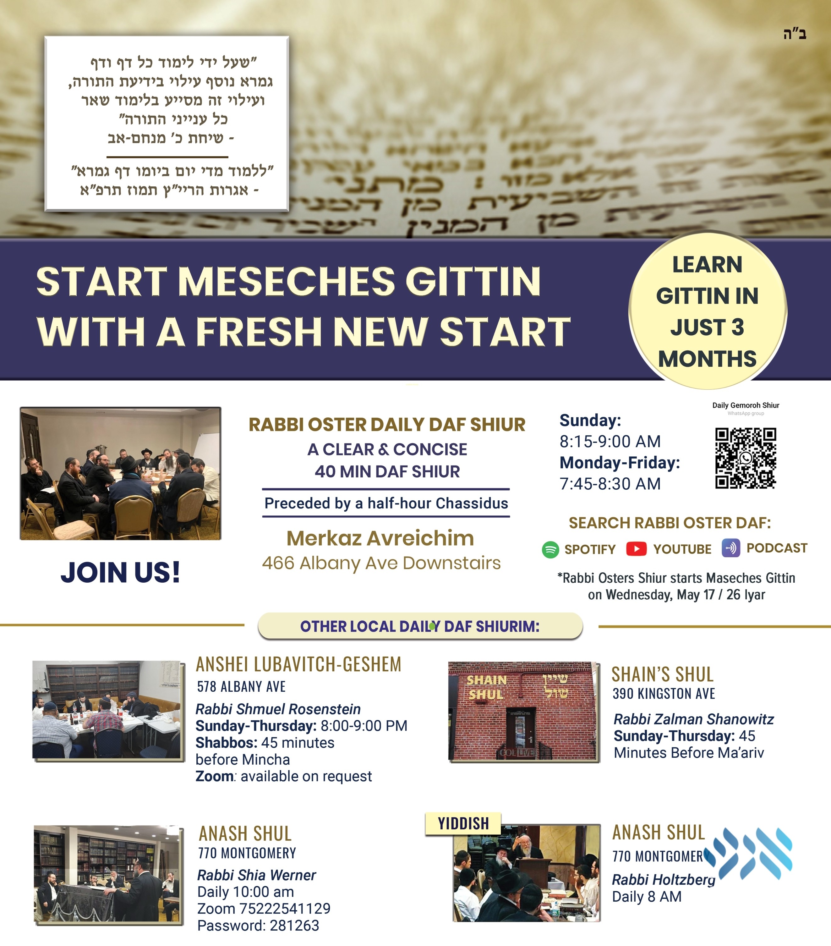Join one of the seven daily Gemara shiurim in Crown Heights (and online) that are starting to learn Maseches Gittin, giving you a unique opportunity to learn Gemara daily! Daily Gemora Shiurim starts this Thursday, 27 Iyar, May 18. (Rabbi Oster’s Shiur starts Maseches Gittin on Wednesday, 26 Iyar, May 17).