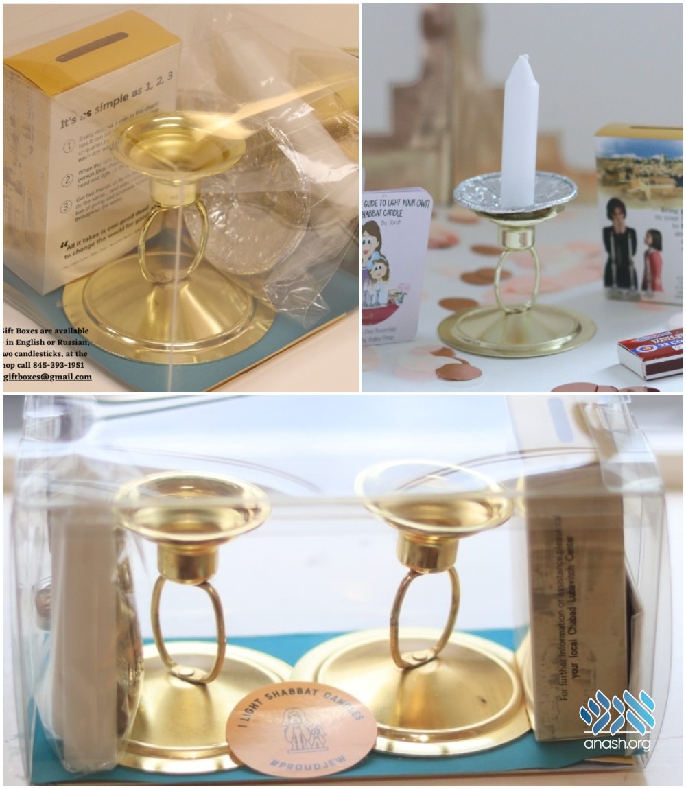 The boxes are in high demand, and over the past year, hundreds of boxes were given out. Many Shluchim are taking them for their communities, teachers are taking them for Hebrew schools, and many people are taking them for mivtzoyim, as a present, or for anyone that they know. The boxes are also available to be shipped to Shluchim or to a friend, at minimum shipping price. Boxes are available in English and Russian, and in boxes with one or two candlesticks for women or for little girls.
