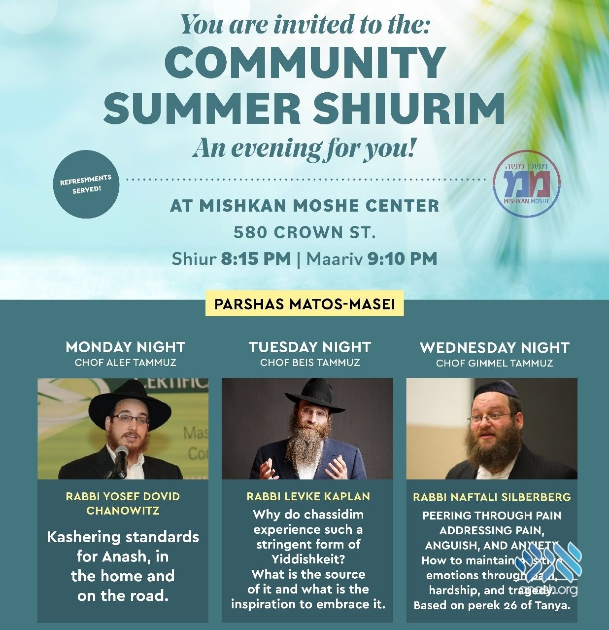 Join the Summer Learning Program with nightly Shiurim by leading magidei shiurim with Refreshments Served!