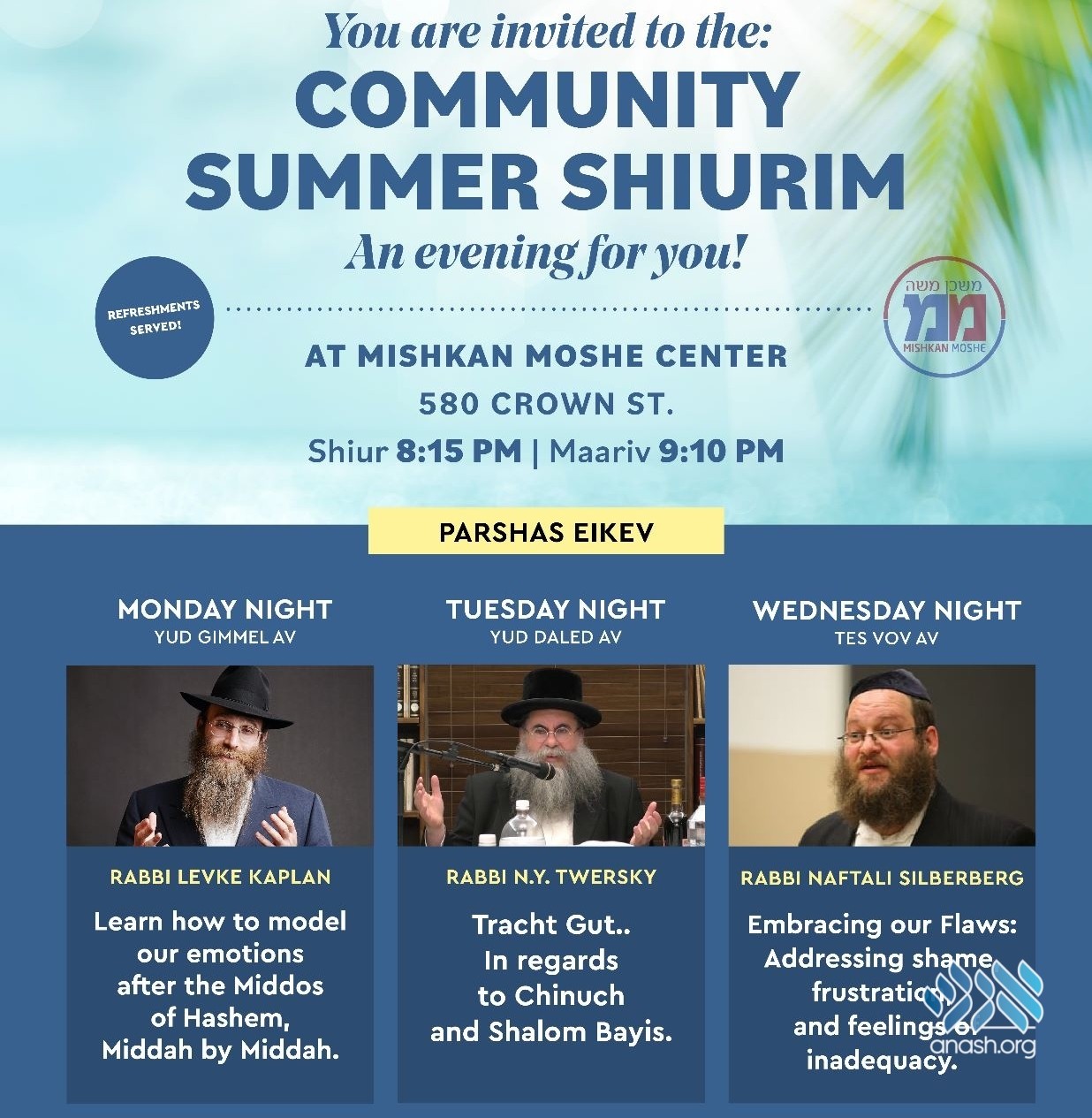 Join the Summer Learning Program with nightly shiurim by leading magidei shiurim with refreshments served!