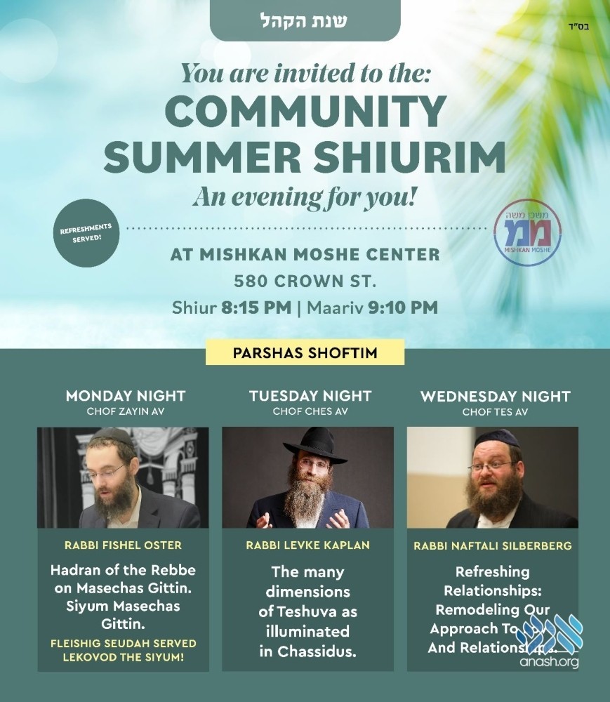 Join the Summer Learning Program with nightly shiurim by leading magidei shiurim with refreshments served!