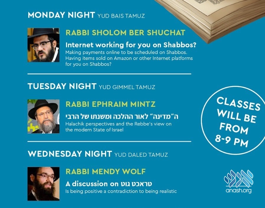 The learning takes place on Monday, Tuesday and Wednesday evenings at the New Beis Medrash, 580 Crown Street, 7:30 – 9:00 pm.