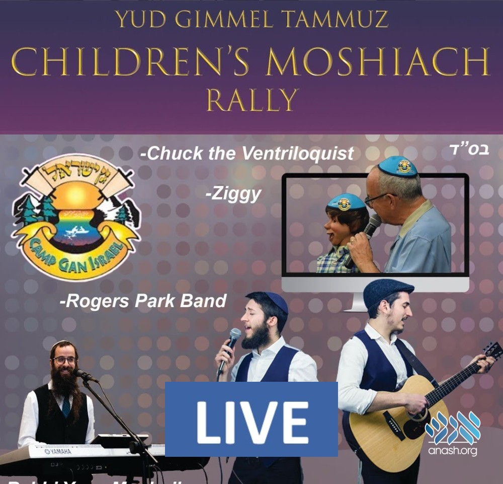 Join Live 1:30 PM ET: Yud Gimmel Tammuz Children’s Moshiach Rally with Rogers Park Band, Chuck the Ventriloquist and his puppet Ziggy, Rabbi Baruch Hecht of Morristown, and more surprises.