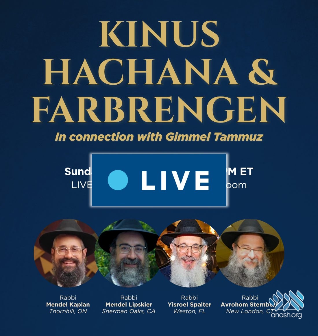 We will hear from Rabbis Mendel Kaplan (Thornhill, ON), Mendel Lipskier (Sherman Oaks, CA), Yisroel Spalter (Weston, FL), Avrohom Sternberg (New London, CT), and others, as we strengthen our hiskashrus to the Rebbe in preparation for Gimmel Tammuz.