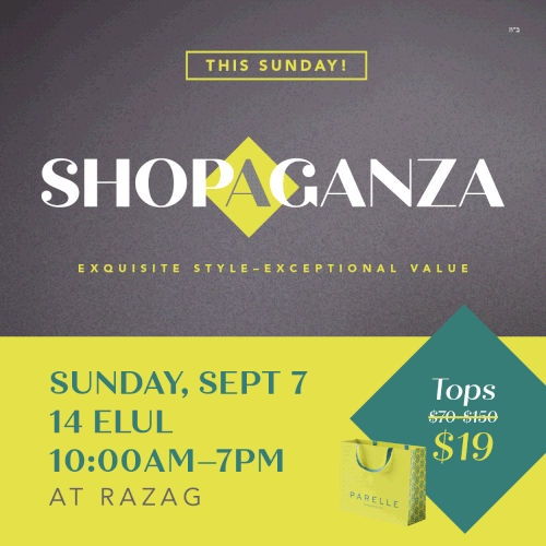 The Shopaganza Event is a not-to-be-missed sale that will be happening on Sunday, 14 Elul – September 7 in the Razag Ballroom!