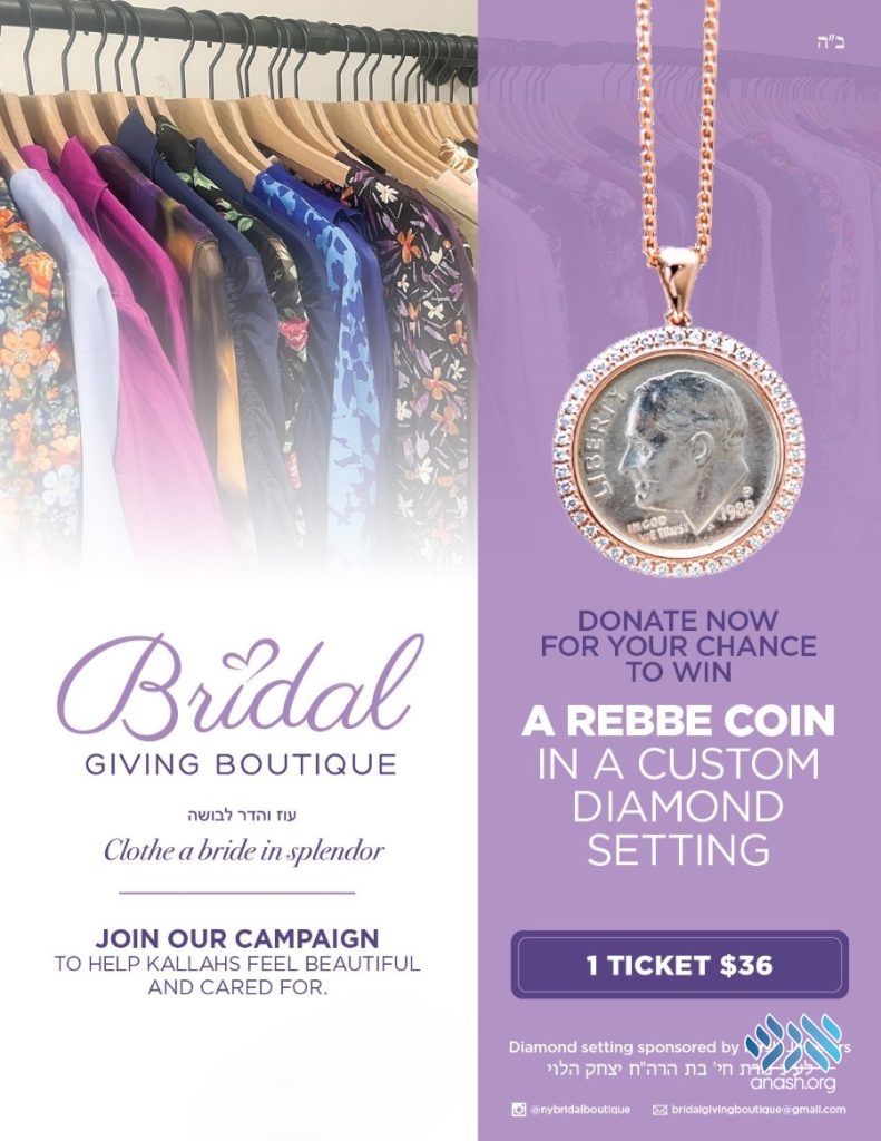 Win a Rebbe Dime in a custom diamond setting by donating just $36 to NCFJE’s Bridal Giving Boutique, which provides new Sheva Brachos outfits to kallahs.