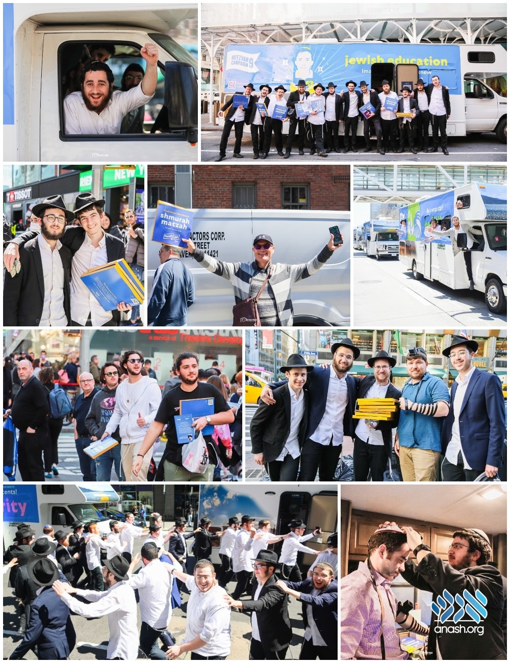 After parading through the streets of Brooklyn and Manhattan, 120 Mitzvah Tanks split up to 120 locations, where they handed out thousands of shmurah matzos, laid tefillin with hundreds, and spread the Rebbe’s message of the imminent geulah.