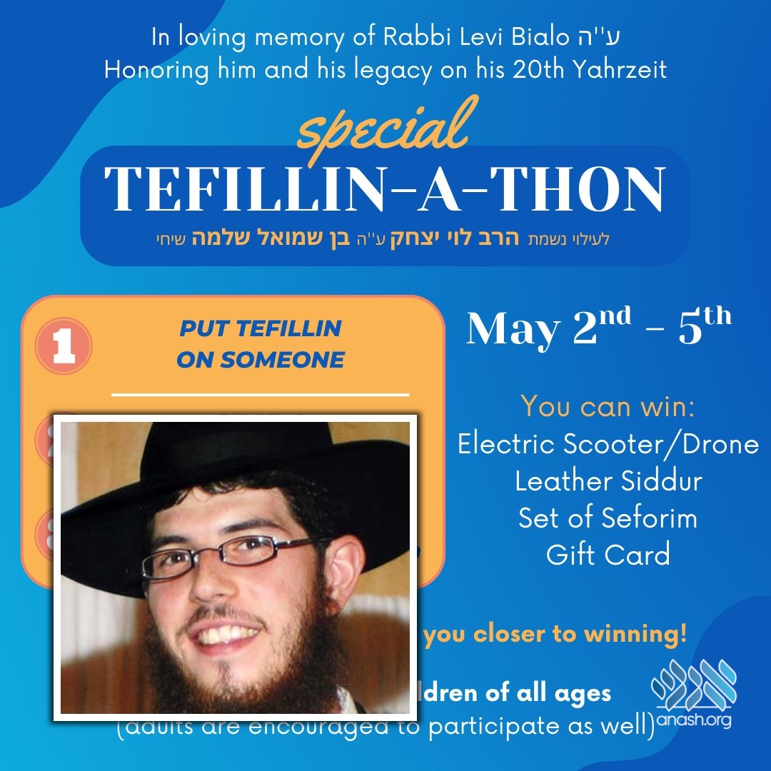 In honor of the 20th yahrzeit of Rabbi Levi Bialo a”h, a special Tefillin-a-Thon was launched, aiming to reach 200 pairs of tefillin in his memory. The event invites bochurim and children of all ages to participate (and adults too!), and win exciting prizes!
