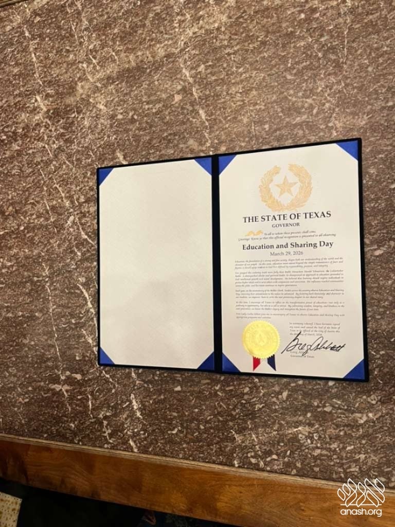 A delegation representing the 140 rabbis and rebbetzins of the 43 branches of Chabad across Texas met today with Governor Greg Abbott as he officially proclaimed Sunday, March 29, 2026, as Education and Sharing Day in the State of Texas.