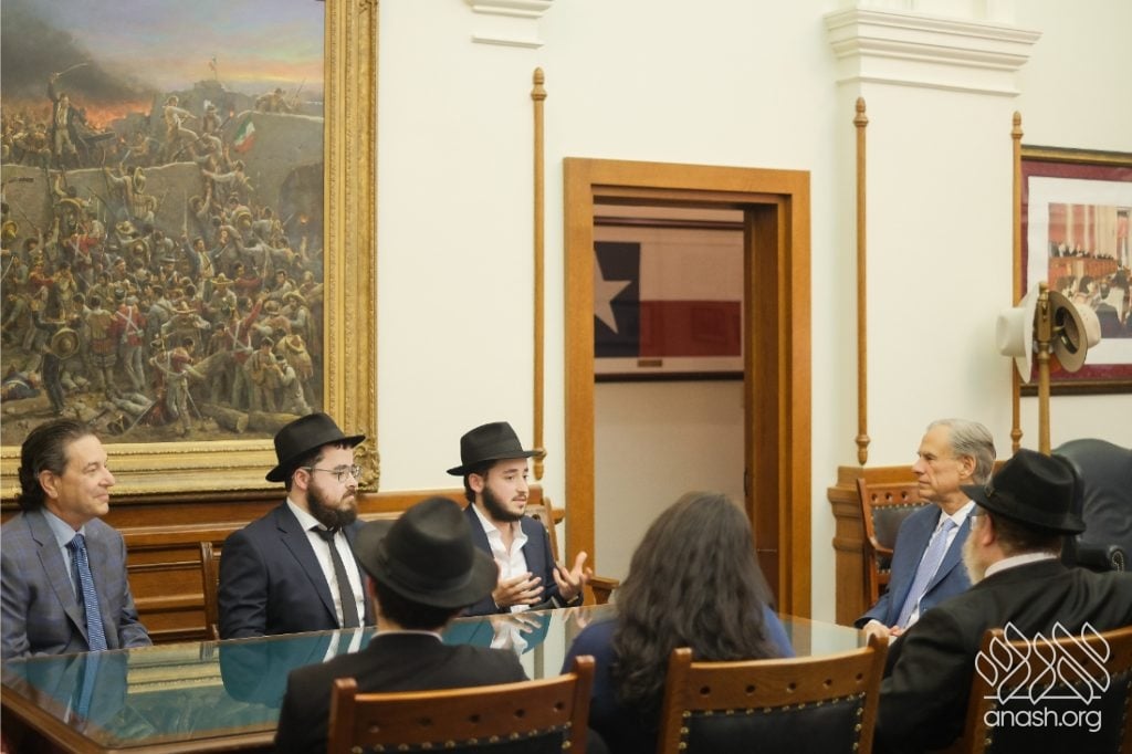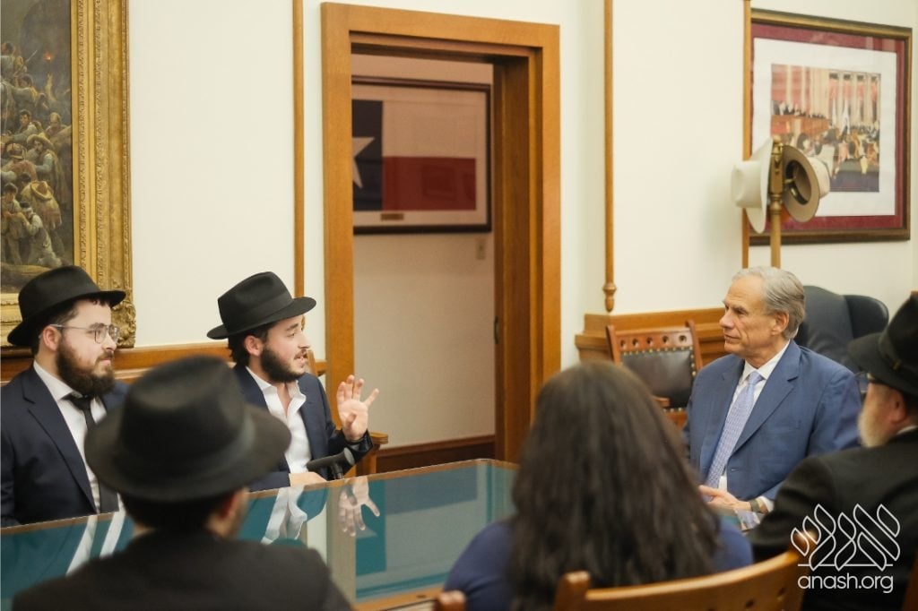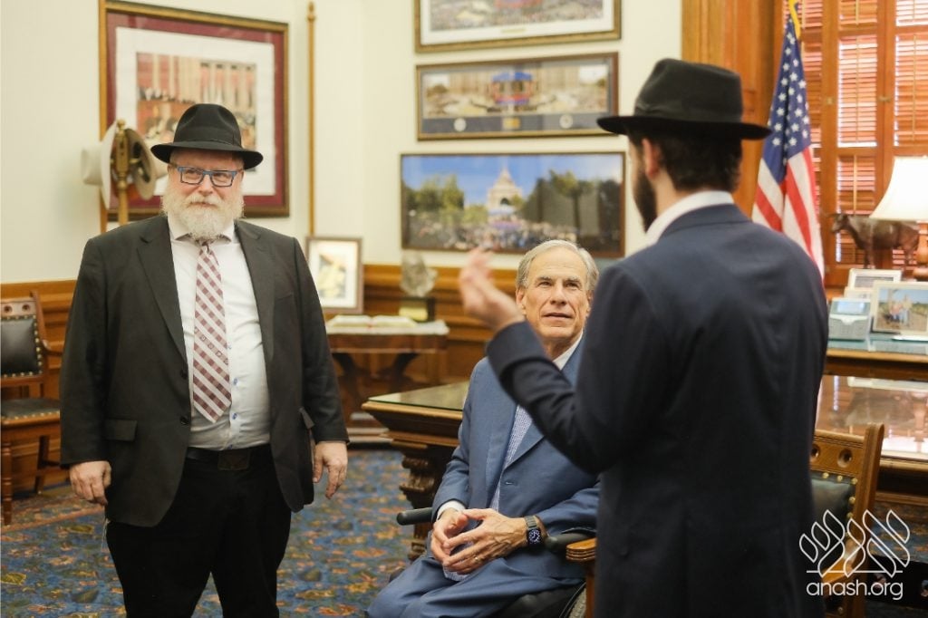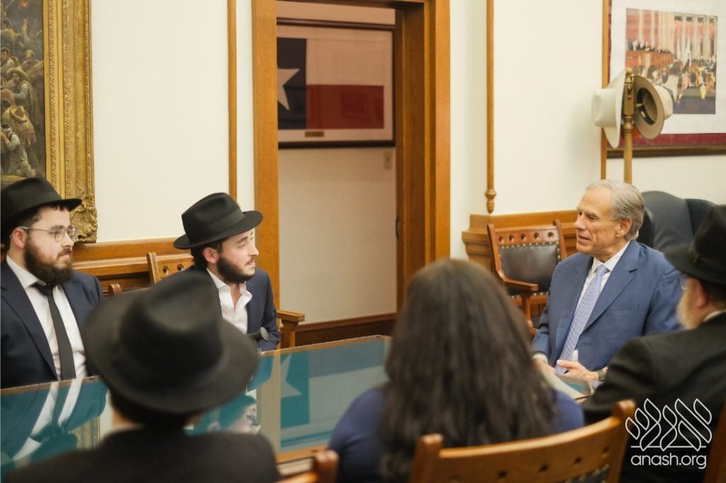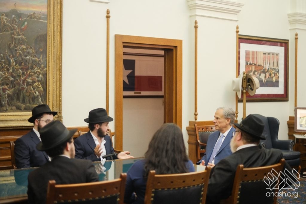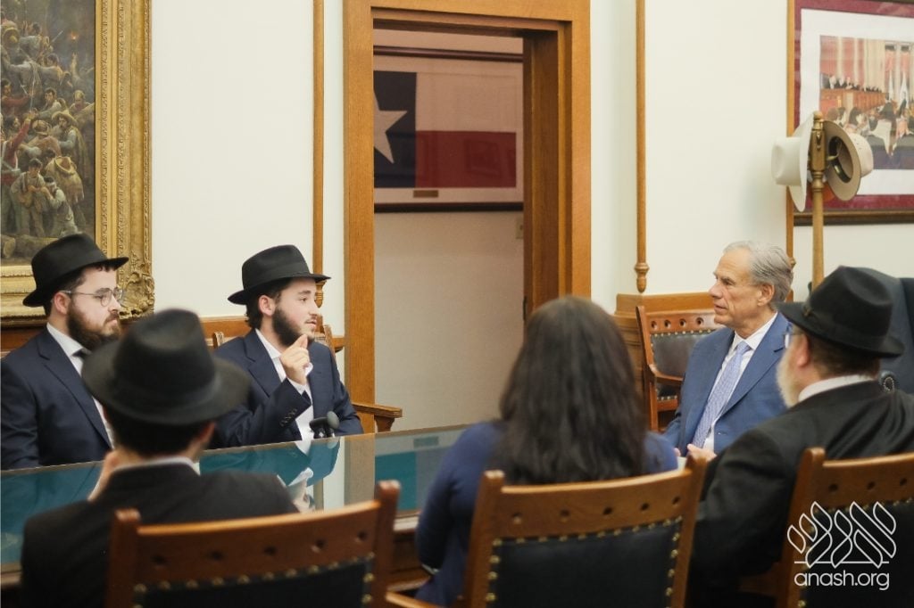 After meeting privately with Bondi survivor Leibel Lazaroff, Texas Governor Greg Abbott met with a delegation of shluchim and shluchos from across Texas as he proclaimed Yud Alef Nissan as Education and Sharing Day in the State of Texas.
