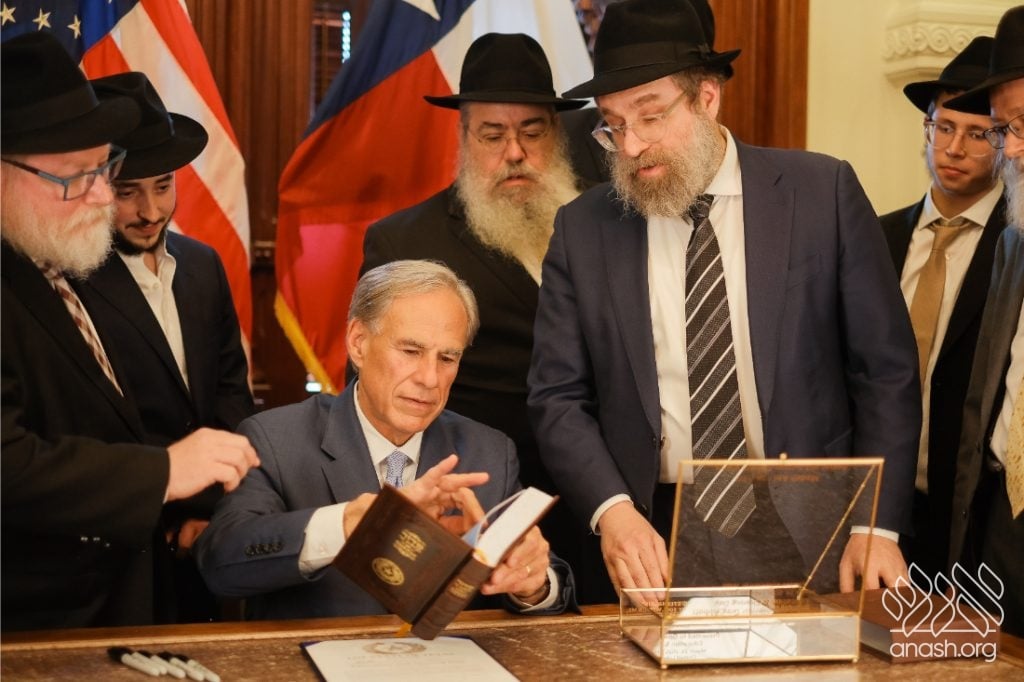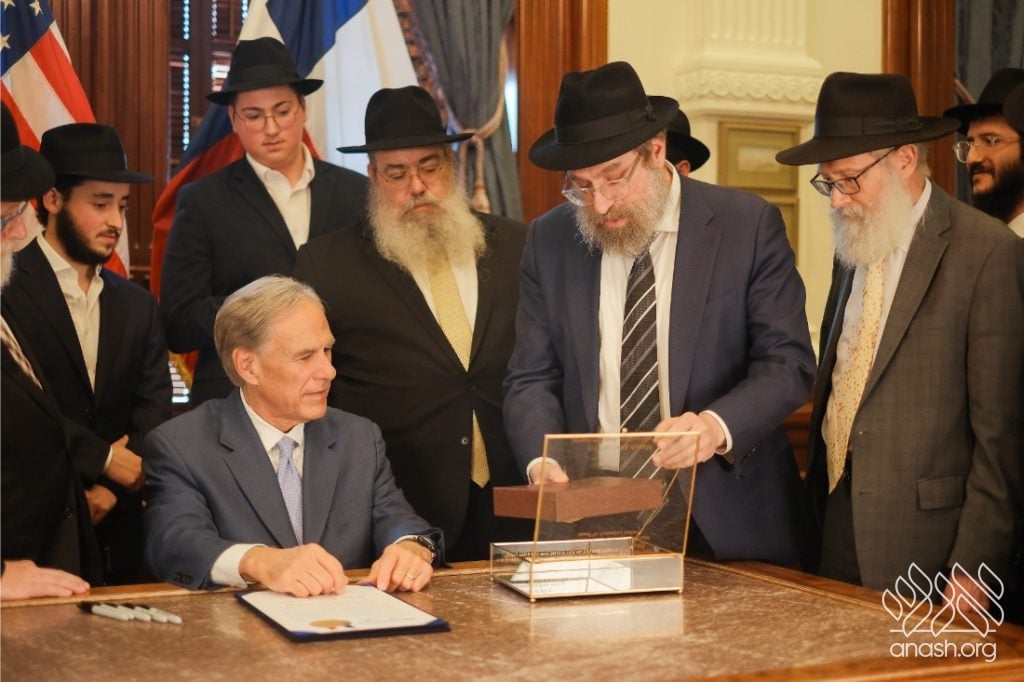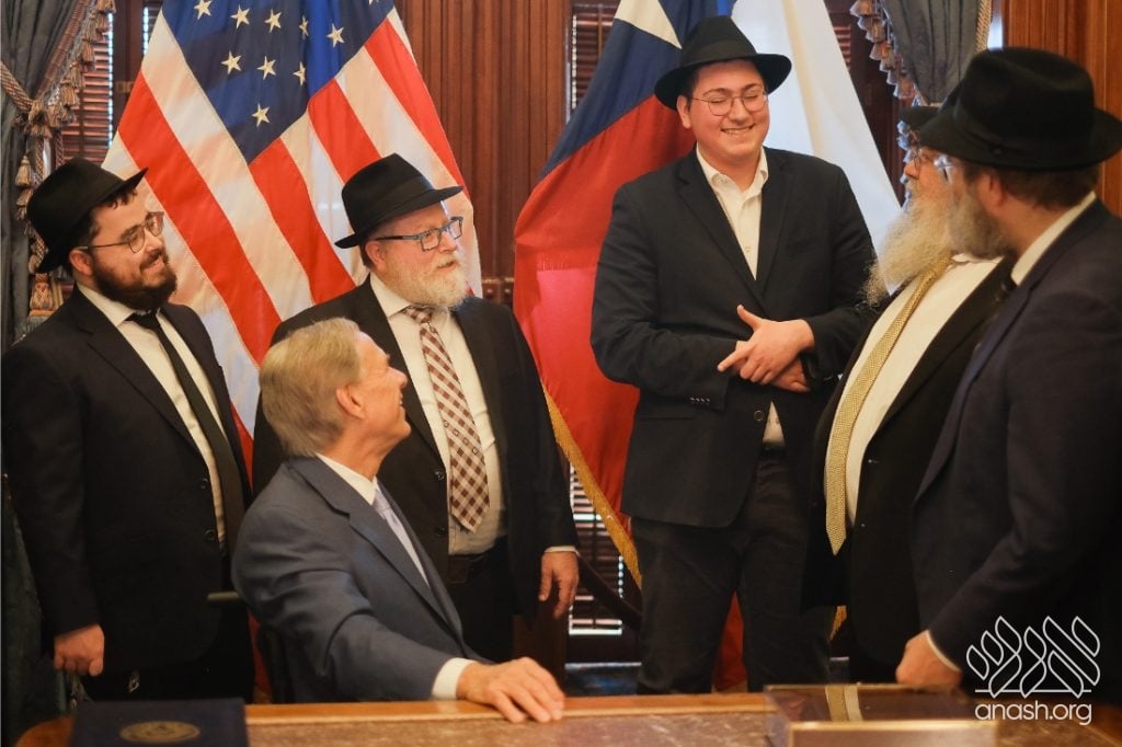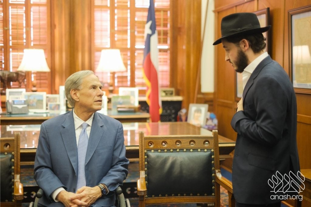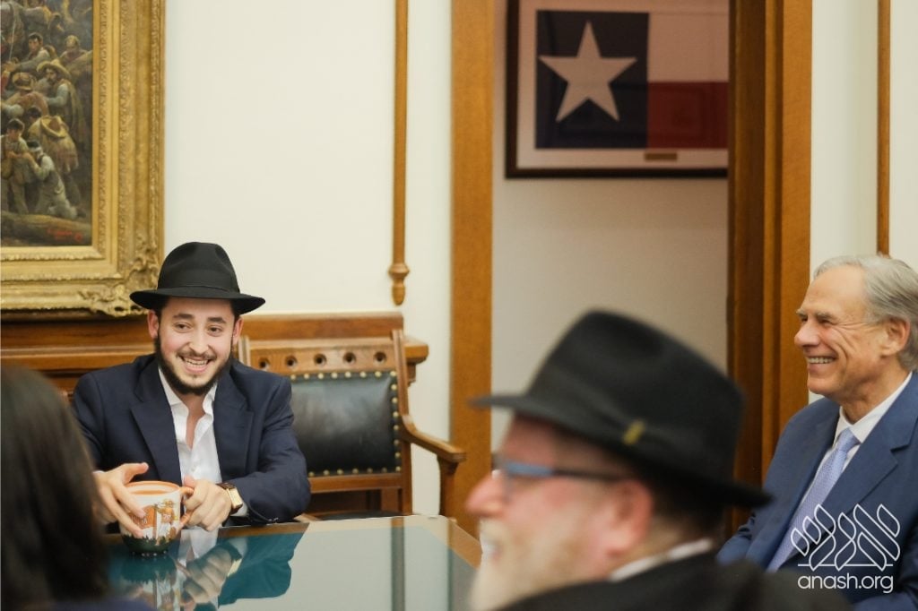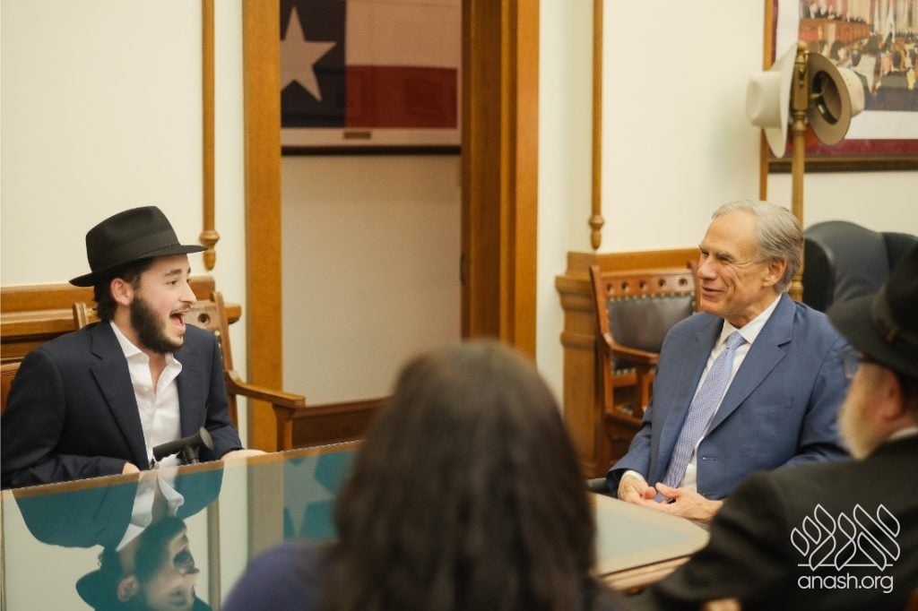 After meeting privately with Bondi survivor Leibel Lazaroff, Texas Governor Greg Abbott met with a delegation of shluchim and shluchos from across Texas as he proclaimed Yud Alef Nissan as Education and Sharing Day in the State of Texas.