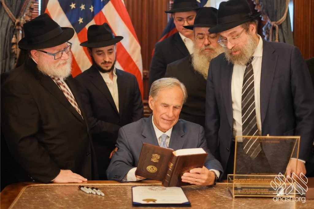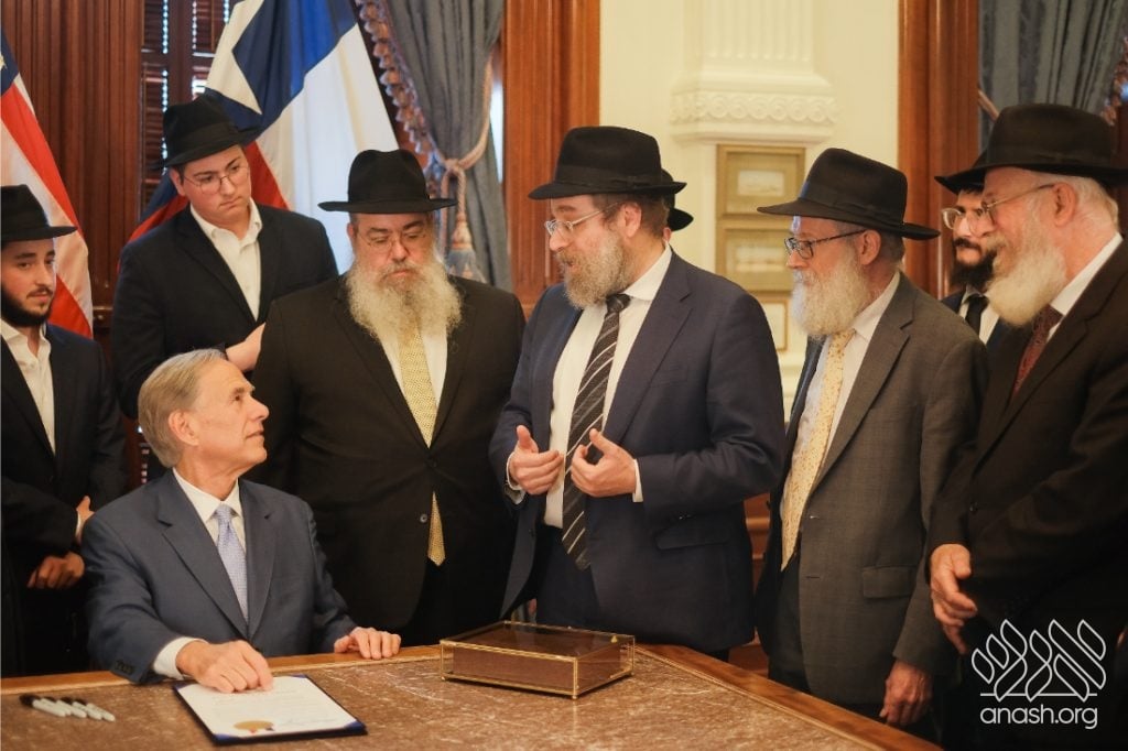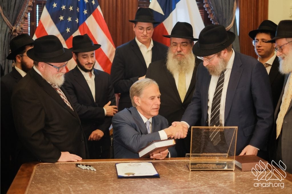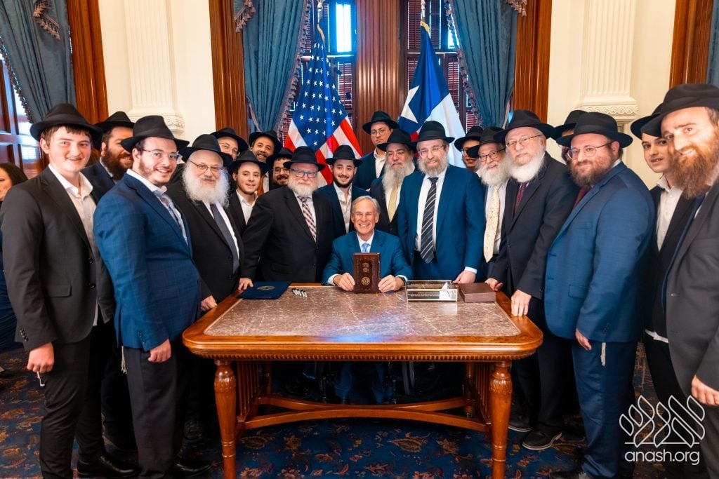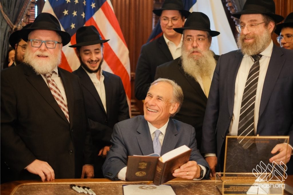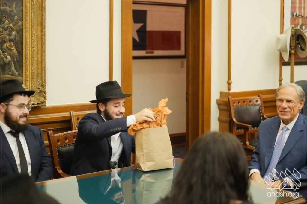 After meeting privately with Bondi survivor Leibel Lazaroff, Texas Governor Greg Abbott met with a delegation of shluchim and shluchos from across Texas as he proclaimed Yud Alef Nissan as Education and Sharing Day in the State of Texas.