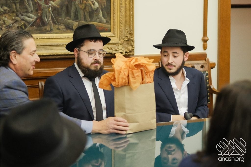 Following the Rebbe’s horaah regarding Canadian Prime Minister Brian Mulroney, a custom siddur was gifted to Governor Abbott by Rabbi Chaim Lazaroff. The siddur highlighted Modeh Ani, the prayer expresses gratitude for life and renewal at the start of every day, a message with universal resonance. In line with the Rebbe’s instruction to Ontario shliach Rabbi Zalman Grossbaum, the siddur was presented in a special presentation box (kis b’toch kis).