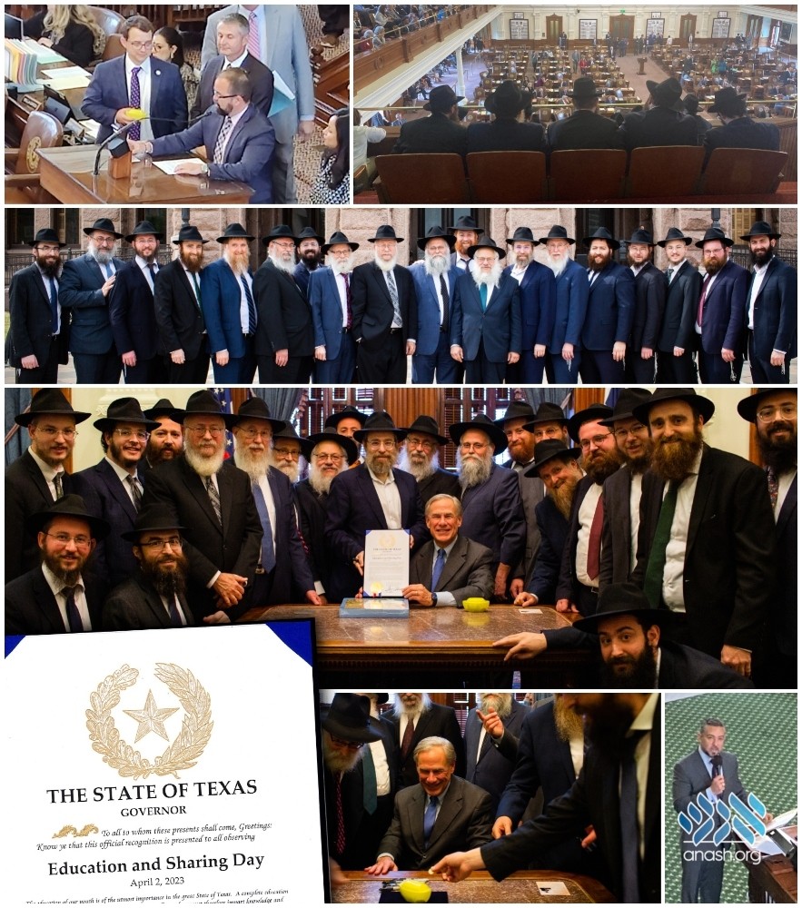 On Tuesday, March 28, a delegation of shluchim representing the 122 Chabad Lubavitch shluchim serving the Texas Jewish community throughout the state, visited the Texas Capitol as a bi-partisan group of state leaders recognized Education and Sharing Day to be observed this year on April 2, 2023.