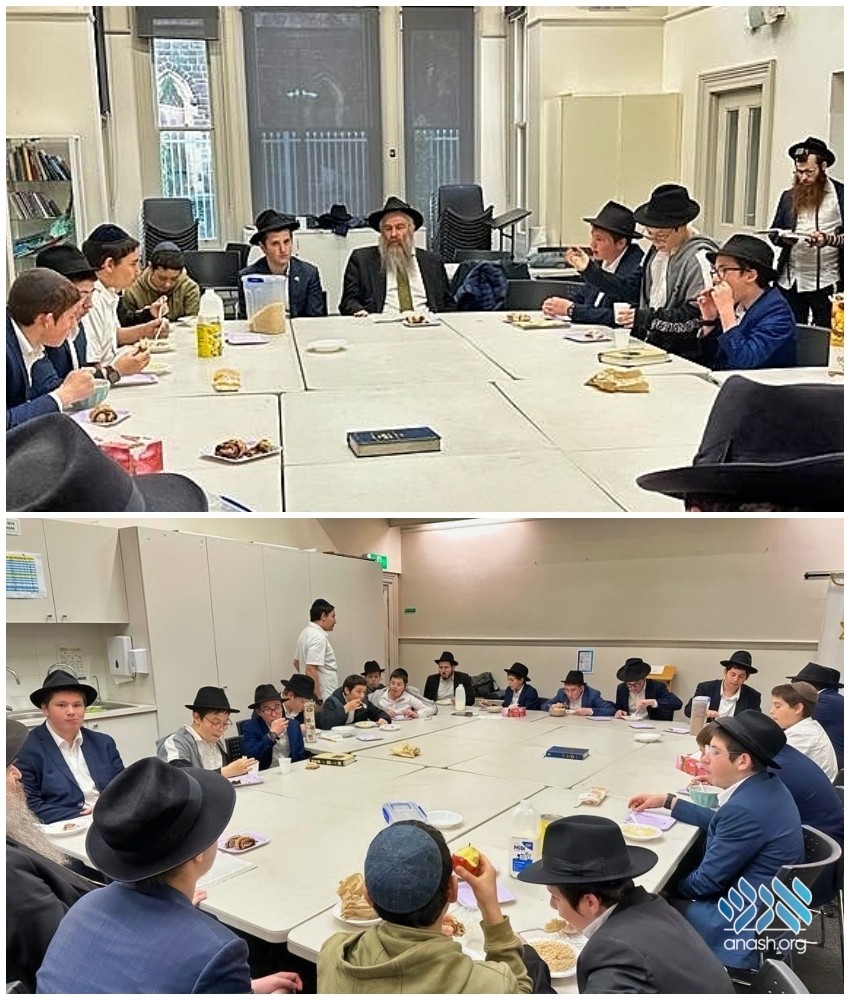 Rabbi Yosef Chaim Kantor concluded his recent visit to Melbourne, Australia with a stop at Cheder Levi Yitzchok, where he met with the older students and farbrenged with them over a special breakfast.