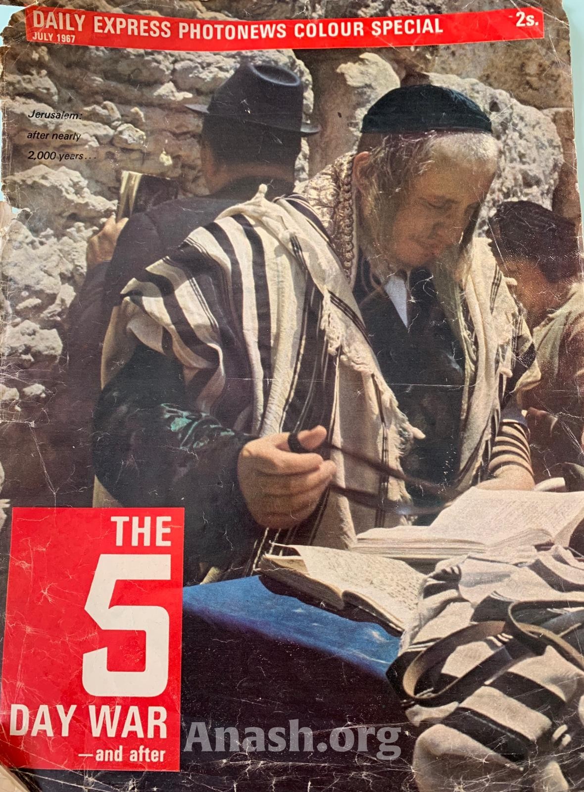 The Daily Express, published in Great Britain, featured a photo of the Kaliver Rebbe, zt”l, removing his tefillin after davening on its front cover in July, 1967/5727, soon after the Kosel was once again under Jewish control. He had moved to Eretz Yisroel only 4 years earlier. That “2S” cover price is seemingly 2 shillings.