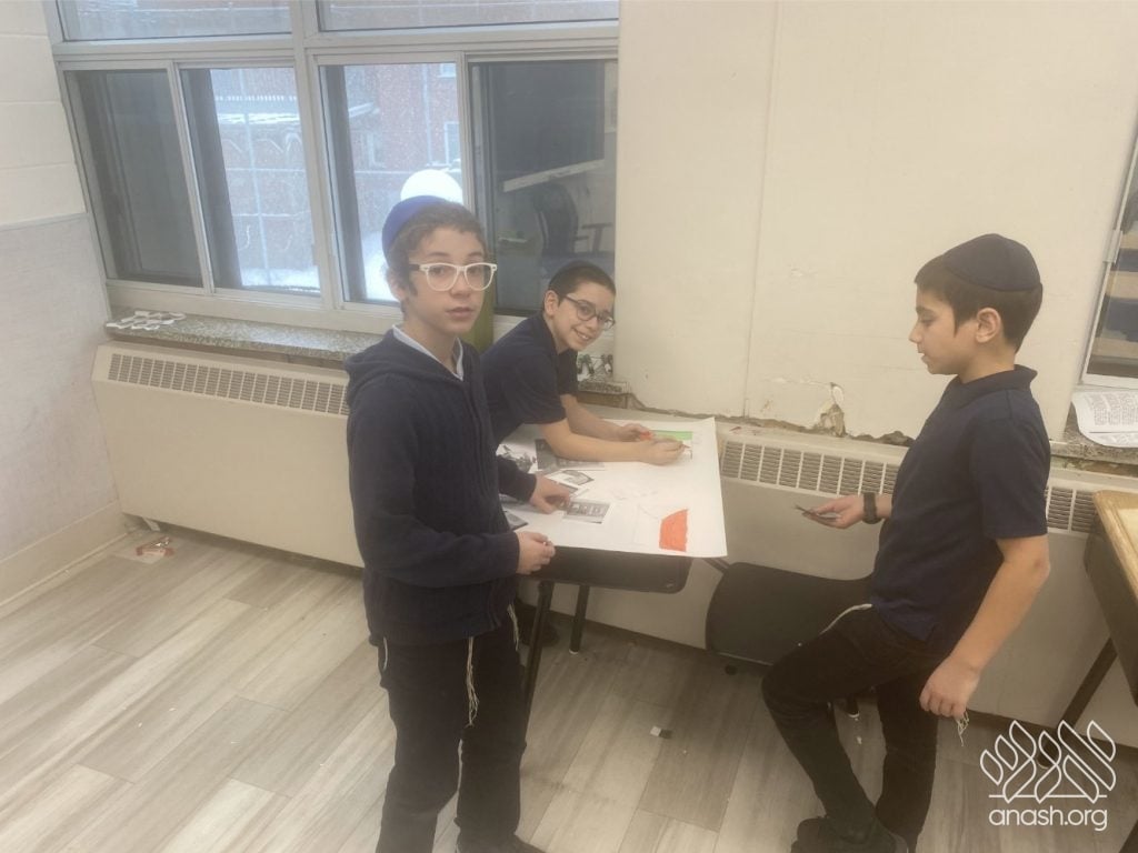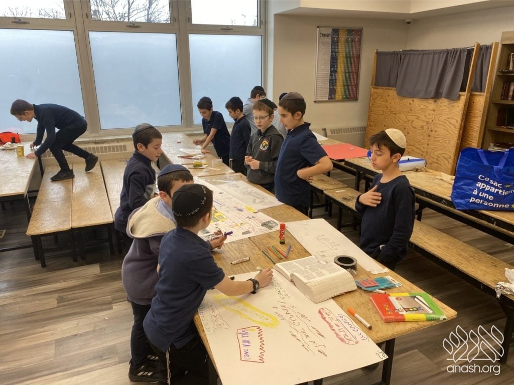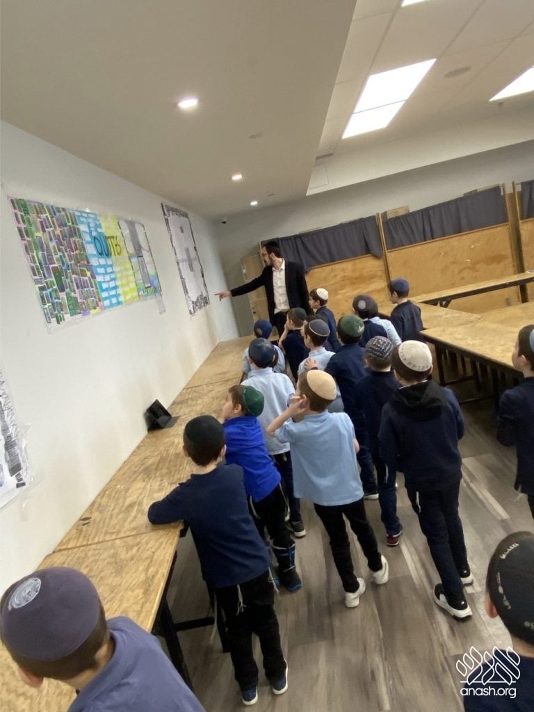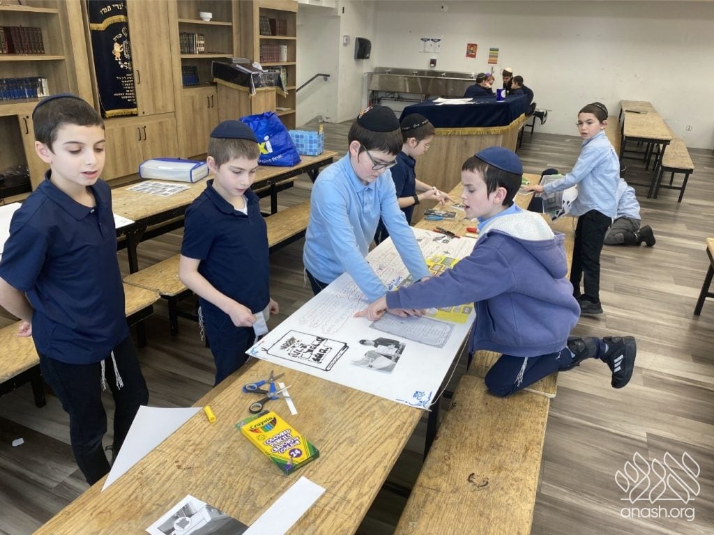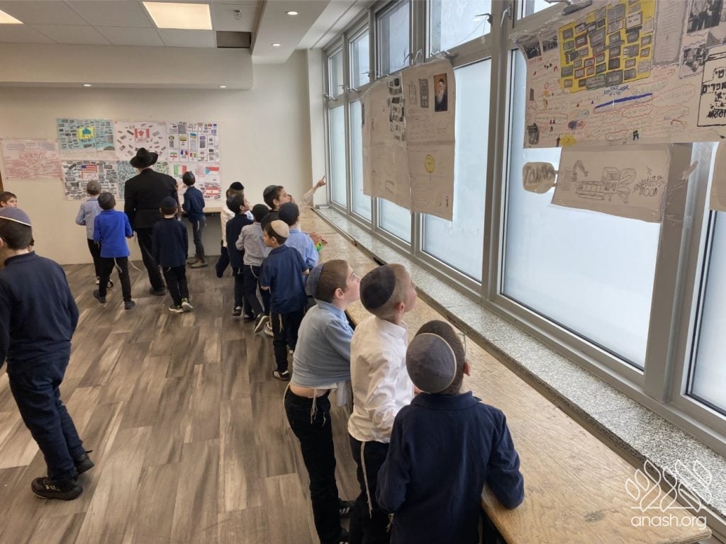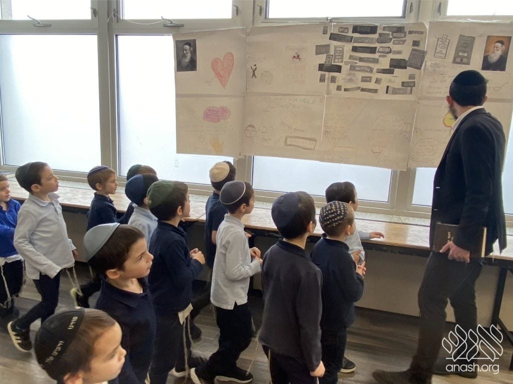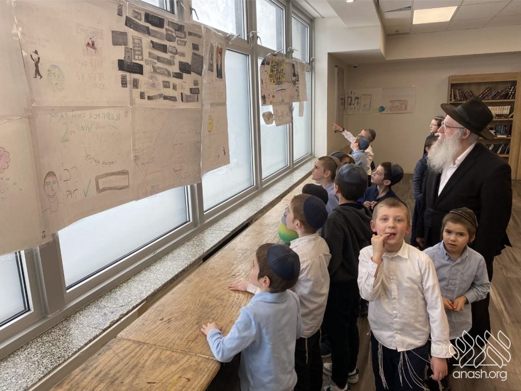 On Tuesday, 24 Teves, our lunchroom was transformed into a “Tanya Poster Gallery.” The younger students (Pre-1A – Grade 3) had the special opportunity to tour the exhibit and view the finished masterpieces. We were also honored to host Rabbi Hershel Raskin, who joined us as the official competition judge to review the impressive work.