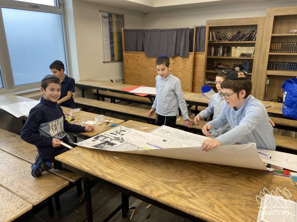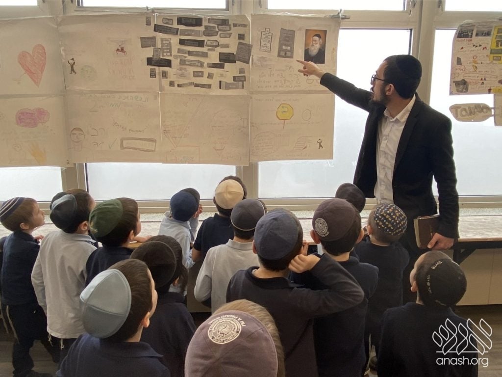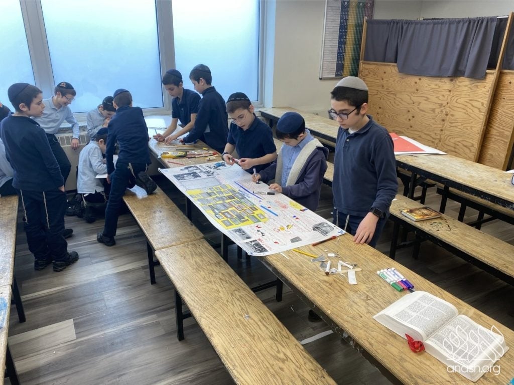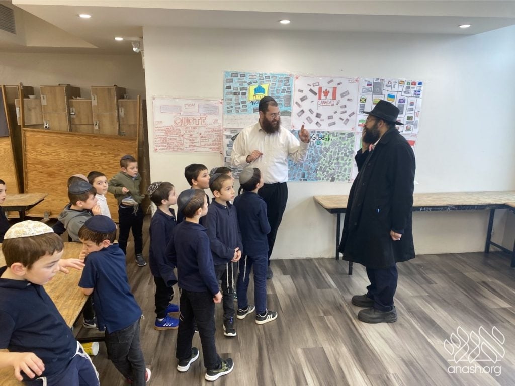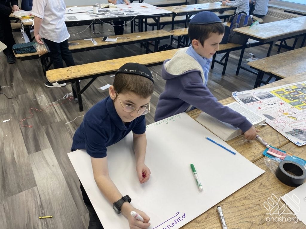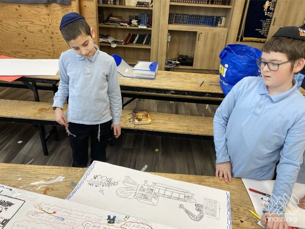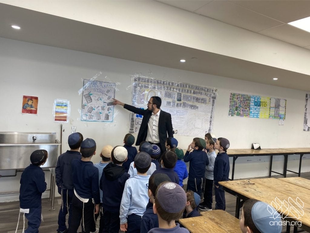 On Tuesday, 24 Teves, our lunchroom was transformed into a “Tanya Poster Gallery.” The younger students (Pre-1A – Grade 3) had the special opportunity to tour the exhibit and view the finished masterpieces. We were also honored to host Rabbi Hershel Raskin, who joined us as the official competition judge to review the impressive work.