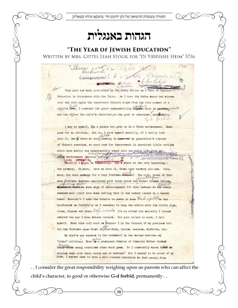 This article was no exception. The Rebbe thoroughly reviewed it, adding several edits. For example, right at the beginning, the author wrote: “As I hear the Rebbe speak and stress over and over again the importance of chinuch, I consider the great responsibility weighing upon us parents who can affect the child’s character to the good or otherwise…” The Rebbe added in pencil after “otherwise”: “G-d forbid.”