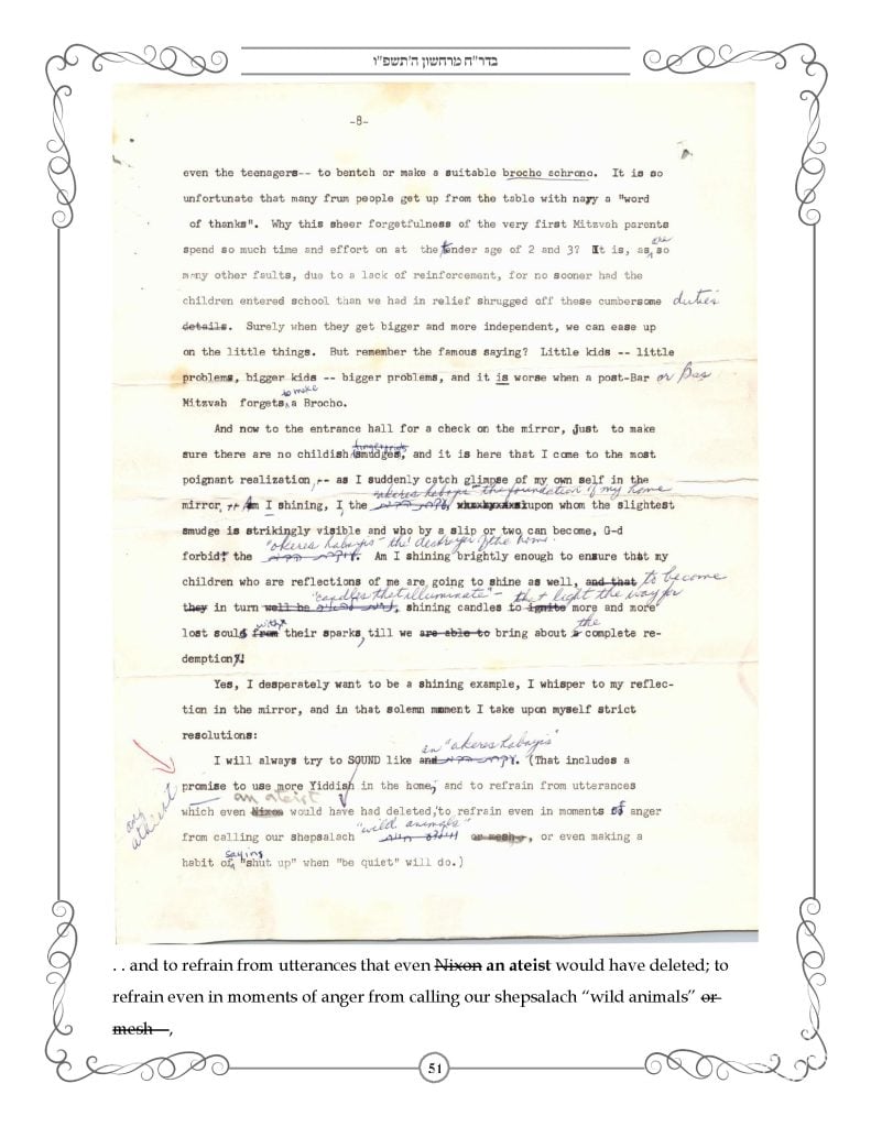 Another notable example occurs toward the end of the article, when discussing Jewish mothers’ resolutions to speak better in the home: “and to refrain from utterances which even Nixon would have had deleted.” The Rebbe crossed out “Nixon” (the former U.S. president who had resigned two years earlier) and replaced it with “an ateist.”