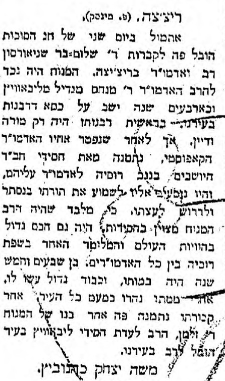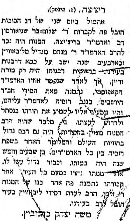 Our next piece, written by a native of Rechitsa, gives us a general impression of the Rebbe, a description of his levayah, and information about some of his children and grandchildren who lived in Rechitsa.