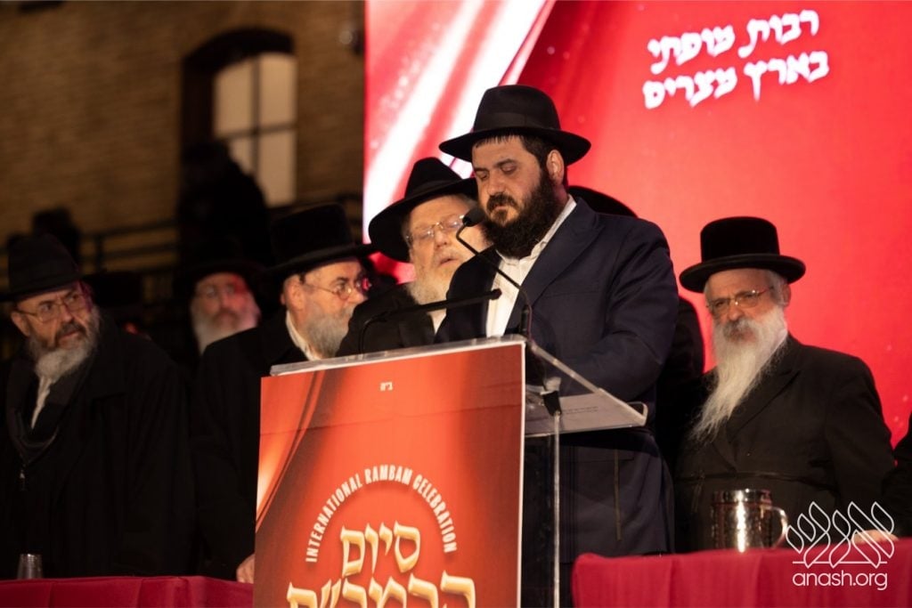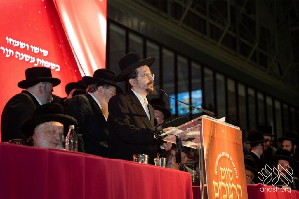 The emcee noted that countless people around the world had completed the present cycle by personally learning three chapters a day, and to mark the completion, the Rebbe of Rachmastrivka, of Oak and Vine, Lakewood, who was also celebrating his own personal Siyum of the Rambam, was invited to deliver words of Torah.