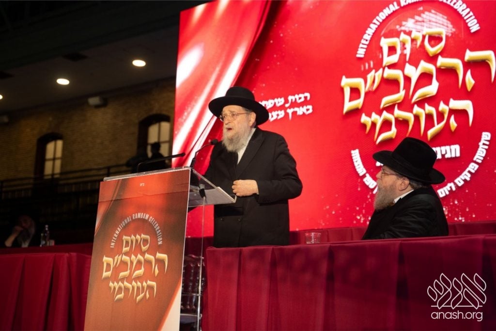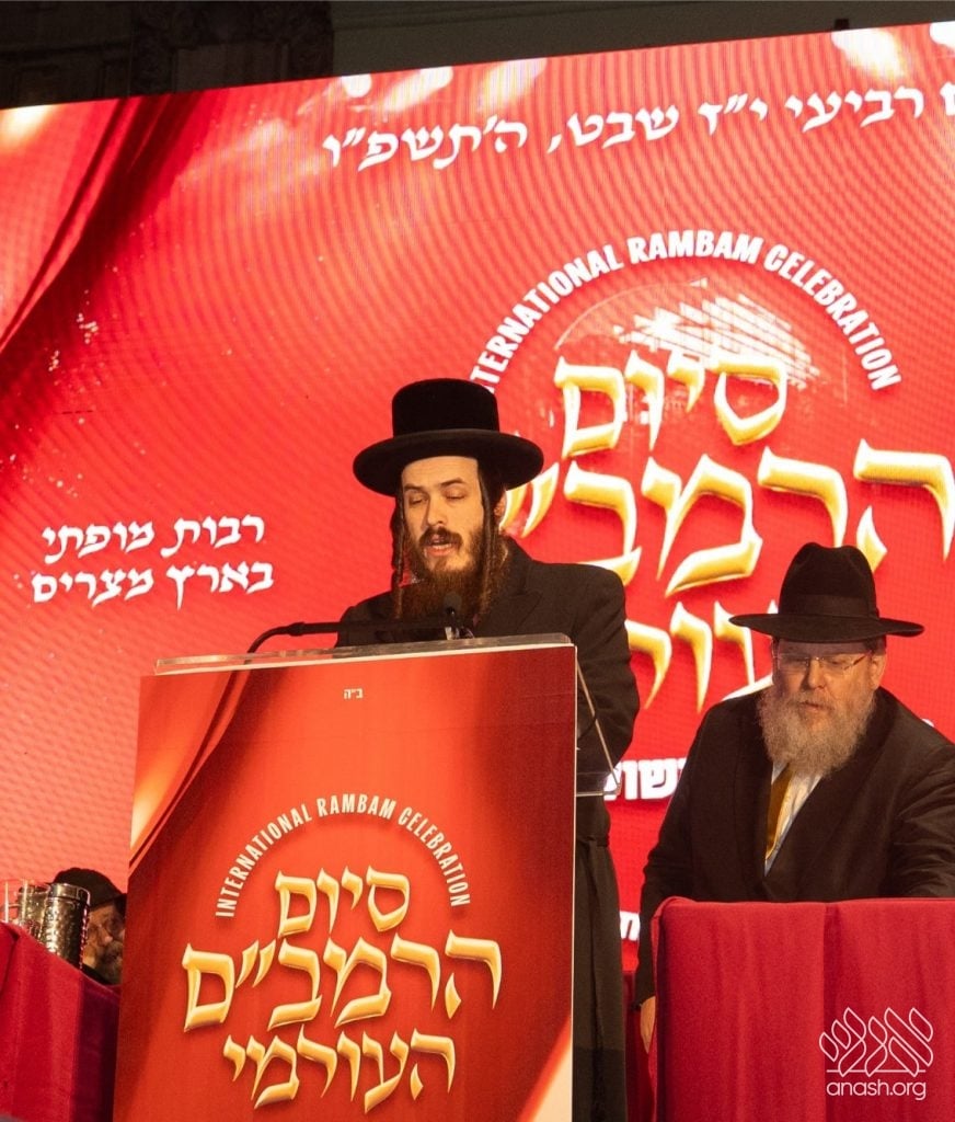 Rabbi Yosef Y. Butman, the organizer of the international Siyum HaRambam, recalled that his father merited, by the Rebbe’s instruction, to organize the global Siyum HaRambam for forty years. He shared that in 5750-5751, the Rebbe wrote to him that the word “Rambam” is an acronym for “Revos Mofsai B’simchas Mishneh Torah”—”abundant miracles in the joy of Mishneh Torah.” Rabbi Butman expressed heartfelt thanks to all who donated generously and urged everyone to become active partners in staging future Siyumei HaRambam.