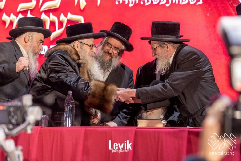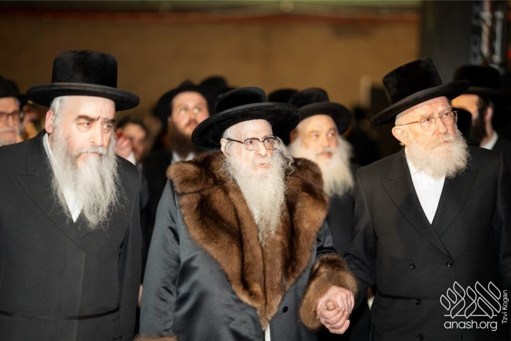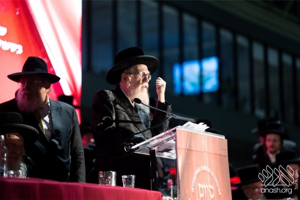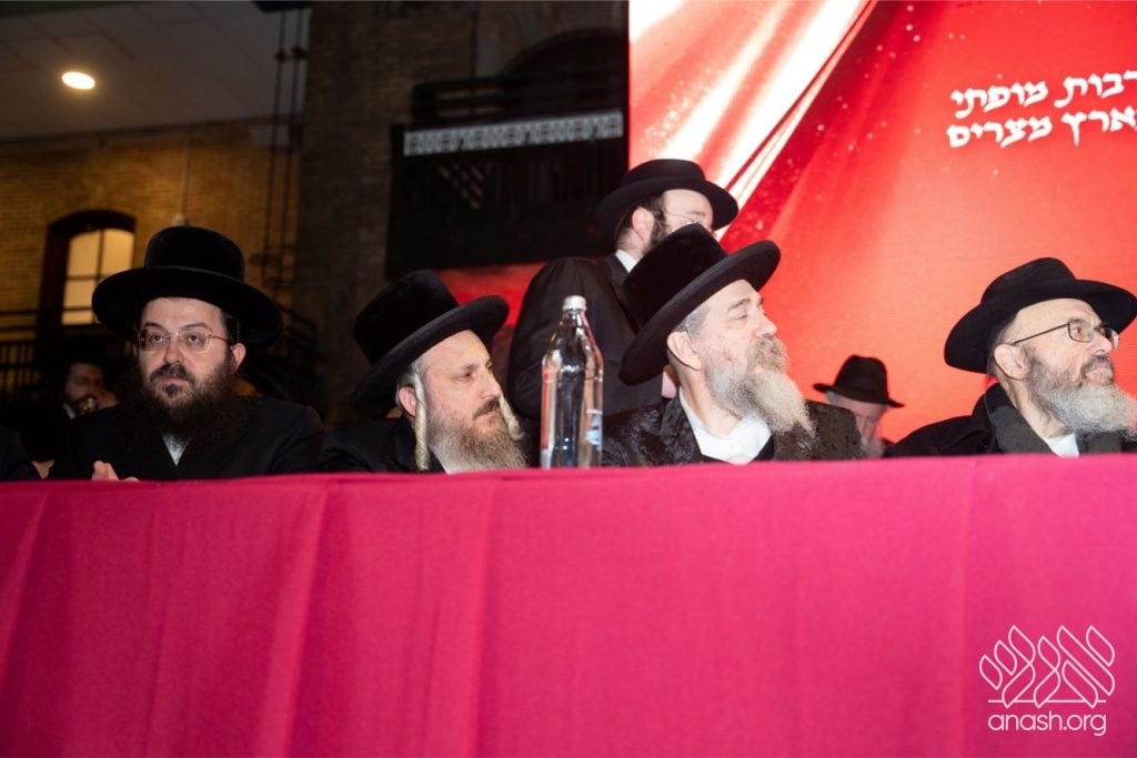 A while later, the Rebbe of Sanz-Klausenburg completed his remarks while seated, apologizing and insisting everyone continue in joy. He elaborated on Hashem’s desire for a dwelling in the lower worlds, where a Jew remains “hard as salt” in his demands of himself and “soft as water” in his love for every Jewish soul, and declared that in the merit of the shluchim in every corner of the globe, we will attain the Rambam’s vision of the world filled with Divine knowledge.