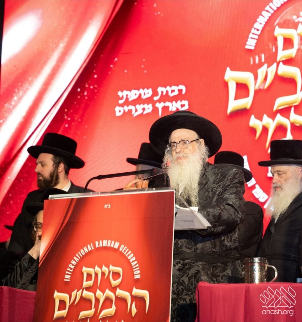 Rabbi Pinchas Shlomo Binet, dayan of the Machzikei Hadas community of Belz chassidim, explained that Rambam study best enables a Jew to truly “acquire Torah.” He announced his personal commitment to study one chapter of Rambam daily, with good-humored permission for anyone to “surpass” him with three.
