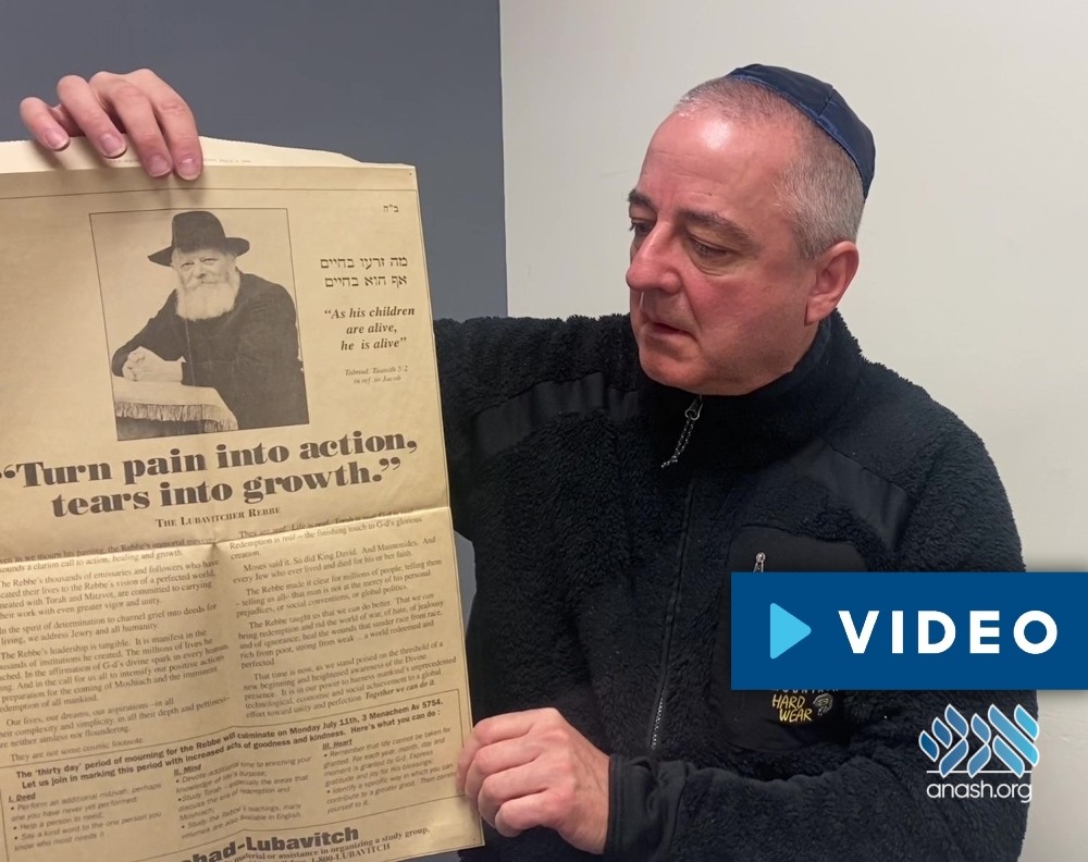 Watch: David Halperin of Anchorage, Alaska, shares how after experiencing personal struggles, he chanced upon an ad about the Rebbe that had been published in the New York Times for the shloshim of Gimmel Tammuz 5754, and how it ended up changing his life.