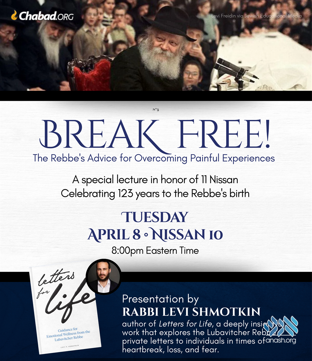 Tonight at 8:00 PM: In honor of Yud Alef Nissan, Chabad.org is holding a webcast titled ‘Break Free: The Rebbe’s Advice for Overcoming Painful Experiences,’ presented by Rabbi Levi Shmotkin, author of the powerful new book ‘Letters for Life.’